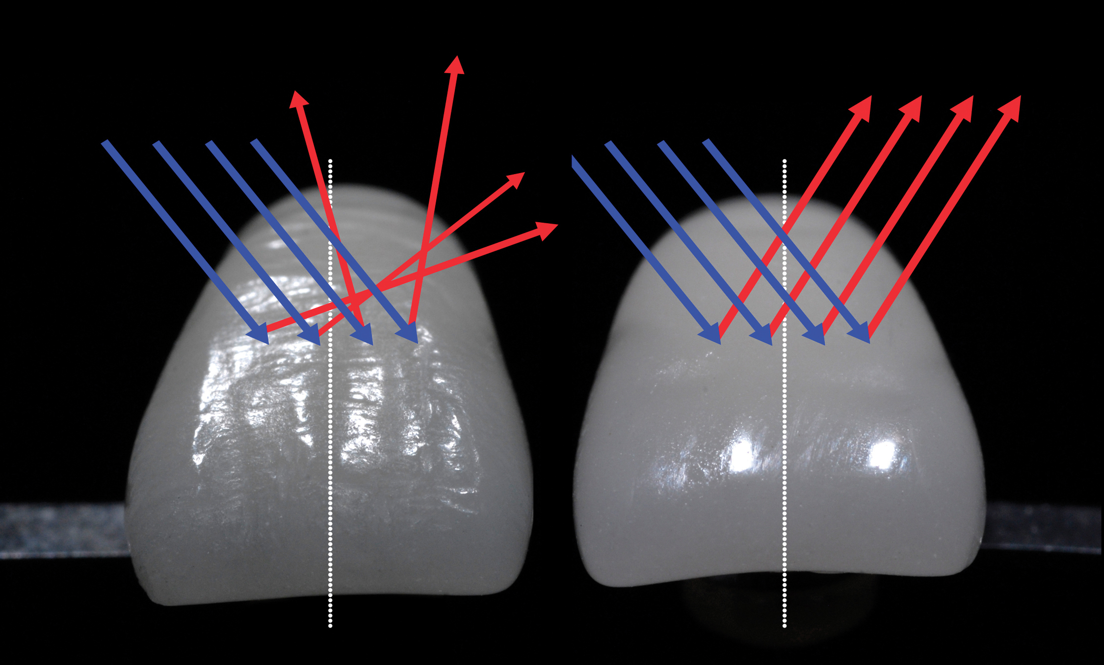 There are different types of reflected lights. A mirror reflection or specular reflection has the same angle of reflection as the angle of incidence (Figure 5). The surface texture of teeth is highly irregular (Figure 6) and will produce a diffuse reflection. A smooth flat surface will produce a mirror reflection (Figure 5). Enamel surface texture varies greatly and affects the appearance of the teeth. Two restorations made from the same material may appear differently depending on the diffuse reflection. Surface texture on monolithic restorations is harder to control, which makes controlling the appearance more difficult.