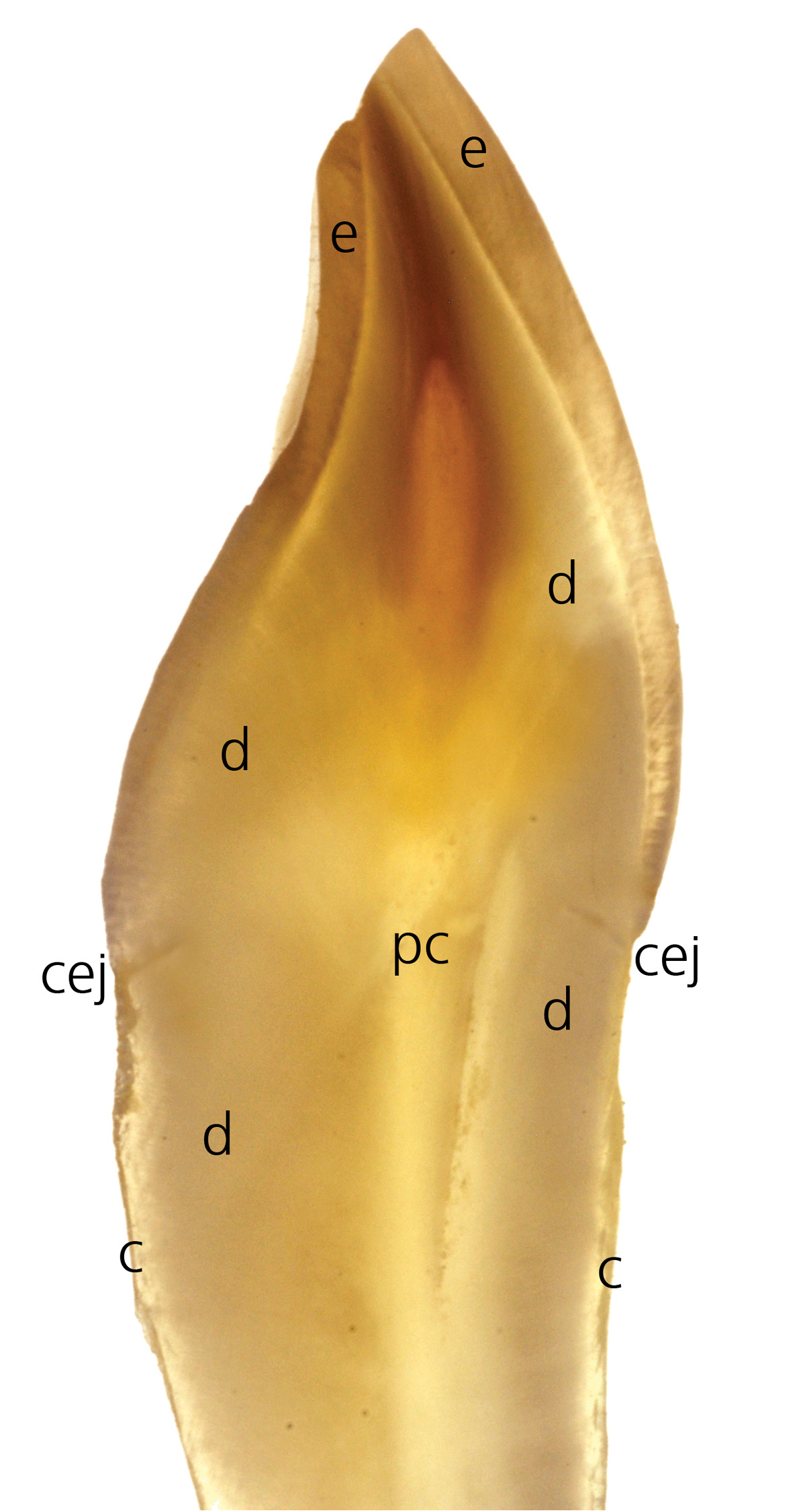The composition of teeth can be seen in Figure 9. The coronal aspect of the tooth is comprised of the pulp chamber, dentin, and enamel, while the root portion of the tooth consists of cementum, dentin, and the pulp canal. For the purpose of this article the cementum and pulp will not be discussed.
