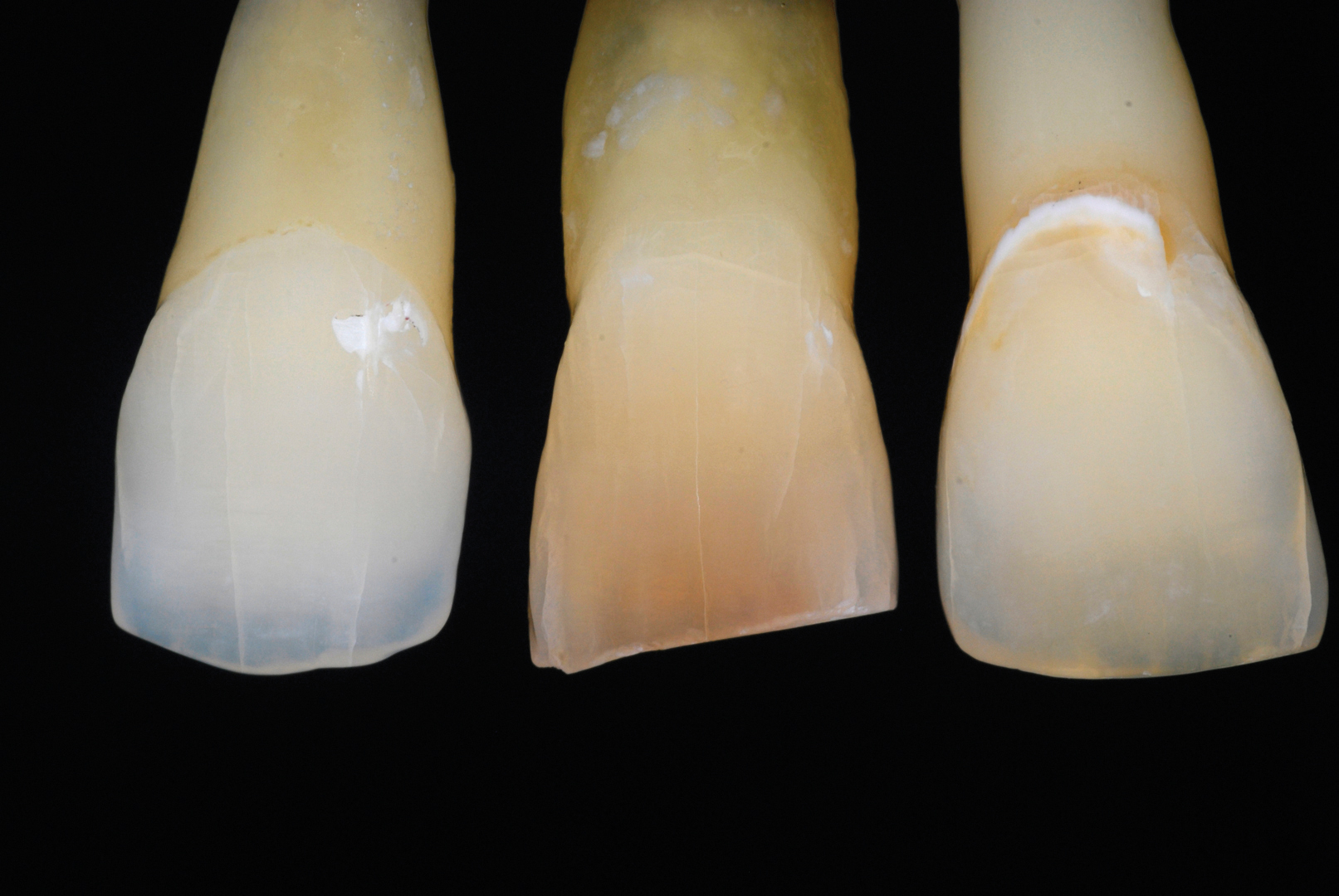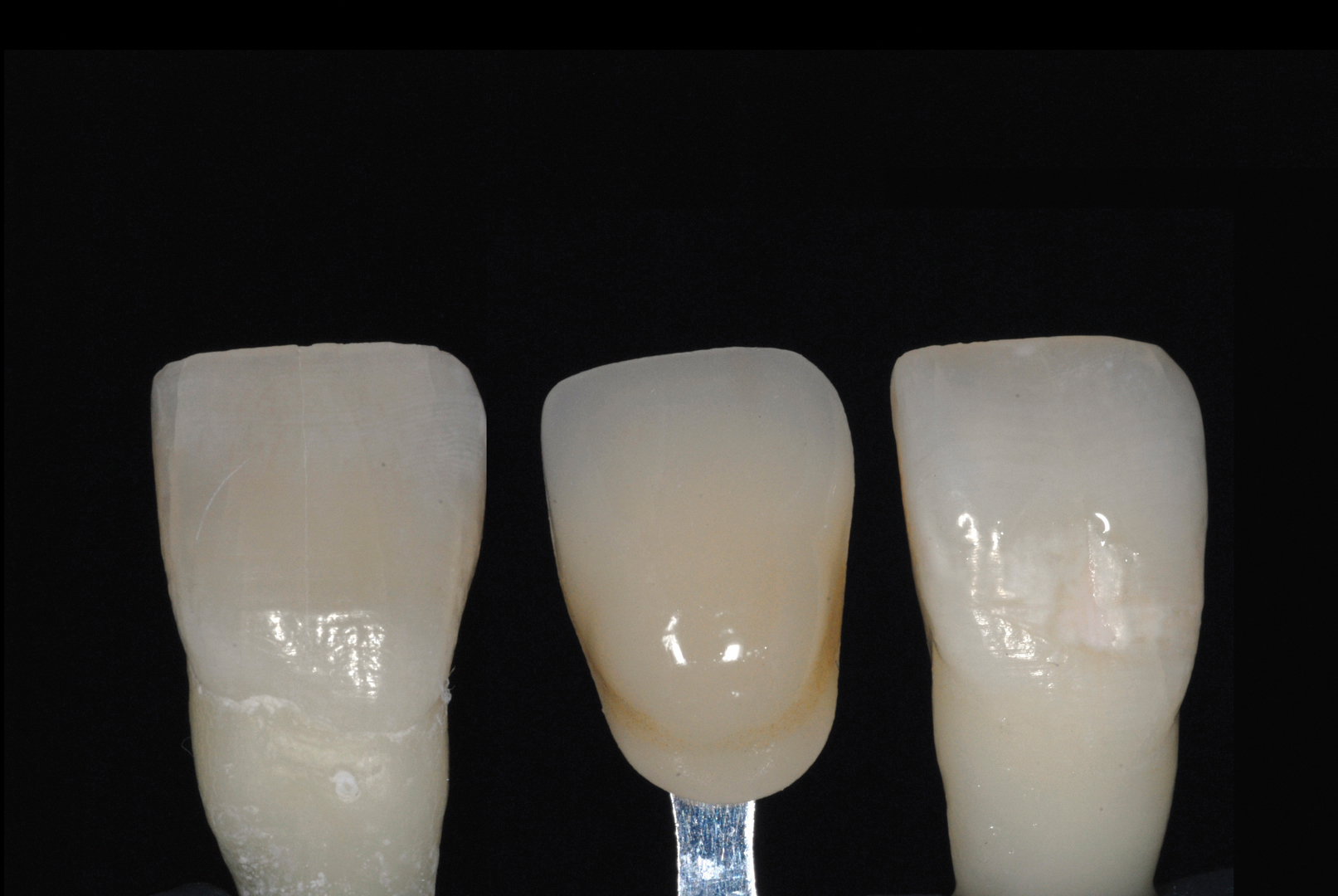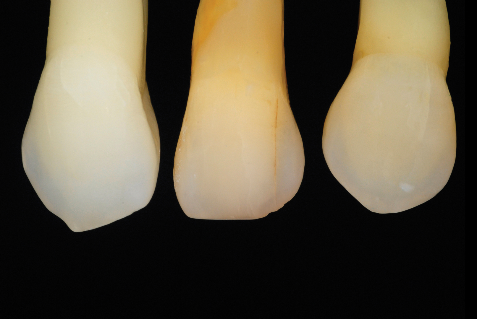 Restorative dental materials have physical and optical properties that attempt to mimic the properties of teeth. Many modern monolithic ceramic materials have defined predictable crystalline structures that do not scatter light in the same way as a natural tooth. To compensate for this esthetic deficiency, a dental technician must layer different colors and opacities of material. Light scattering within homogenous monolithic materials makes the replication of teeth nearly impossible. In Figure 8 the natural tooth section on the right is 0.55 mm thick. From this cross-section it is easy to see the optical complexities of tooth structure. The feldspathic ceramic cross-section on the left is 1.5 mm thick (Figure 8). This cross-section shows the different layers of material that are necessary to mimic natural teeth. The sample in the center of Figure 8 is a replica of the left sample. It is made from monolithic zirconia. The zirconia cross-section shows the optical challenges a dental technician faces when using this material to match teeth. Monolithic materials have gained in popularity but present substantial esthetic challenges.