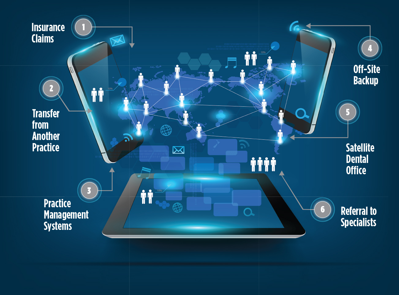 A properly designed and installed network enables movement of files between operatories, workstations, offices, practices, and insurers (Figure 4). Viewing the same information on different computers or workstations requires a computer network that enables sharing information on multiple machines. The value of a properly designed and secured network cannot be overstated. An improperly designed and installed network is the cause of many of the problems reported in daily system use.
