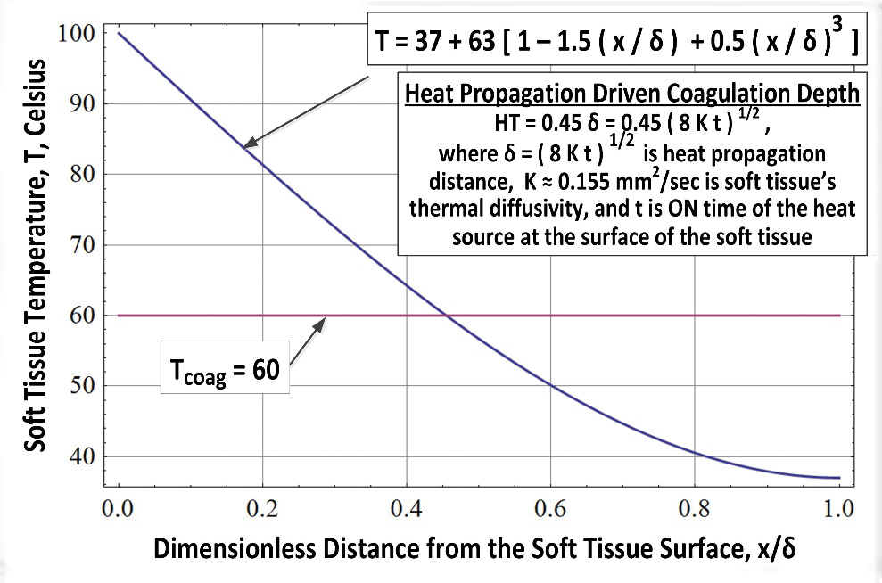 For nonablative long-pulse settings, the heat propagation-driven coagulation depth, HT, can be derived from the temperature profile inside the tissue, approximated as T = 37 + 63 (1 – 1.5 (x/δ) + 0.5 (x/δ)3)9-12 and illustrated in Figure 3 (for the ablation temperature of 100°C, coagulation temperatures of 60°C to 100°C, and body temperature of 37°C, where δ = (8 K t)½ is the heat propagation distance,9-12 K ≈ 0.155 mm2/sec is the soft-tissue thermal diffusivity,4 and t is the pulse duration or the “ON” time of the heat source at the surface of the tissue) for HT >> H conditions. The heat propagation-driven coagulation depth HT = 0.45 (8 K t)½ contains the 60°C to 100°C tissue temperatures as indicated in Figure 3. For long-pulse erbium lasers (short depth of photothermal coagulation H = 3 µm to 10 µm [Figure 1]), the heat propagation-driven coagulation depth HT can exceed 20 µm (ie, HT >> H) for pulse durations of 2 msec and longer. For long-pulse CO2 lasers (depth of photothermal coagulation H = 50 µm [Figure 1]), the heat propagation-driven coagulation depth distance HT can exceed 200 µm (ie, HT >> H) for pulse durations of 200 msec and longer.