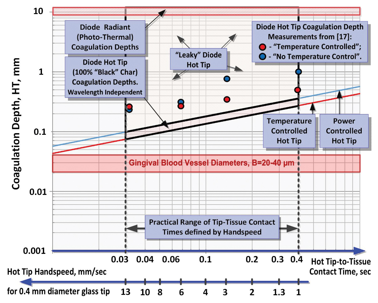 Unlike CO2 and erbium lasers, the soft-tissue ablative dental diodes are contact thermomechanical cutting devices. Their coagulation depth depends on the degree of the diode’s glass tip charring and can range from sub-millimeter (heat propagation-driven coagulation for significantly charred tips) to multi-millimeter (photothermal radiant coagulation for poorly charred tips).