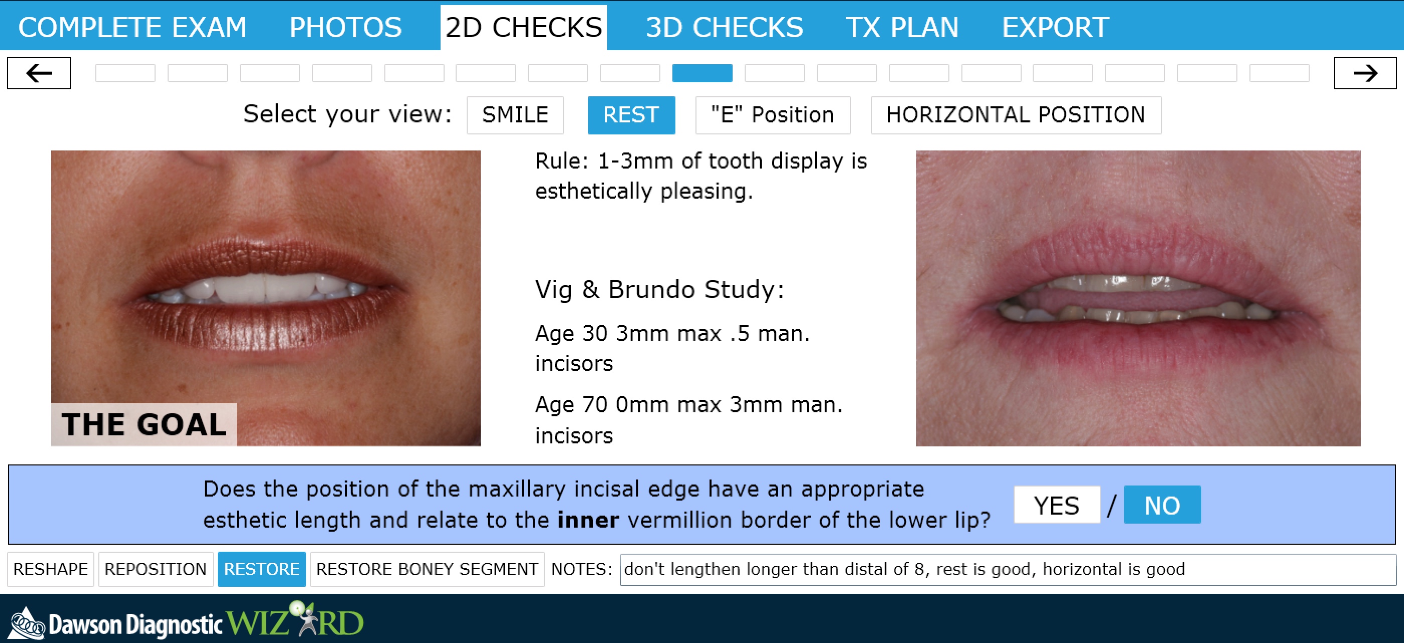 In the case of a worn dentition, it becomes increasingly critical to restore the teeth meeting these functional requirements and to consider restoring the anterior teeth 3-dimensionally. Specifically, this involves placing the maxillary anterior incisal edges in the proper position. This edge position, both vertically and horizontally, affects the envelope of function, anterior guidance, posterior disclusion, esthetics, phonetics, neutral zone harmony, and lip comfort.