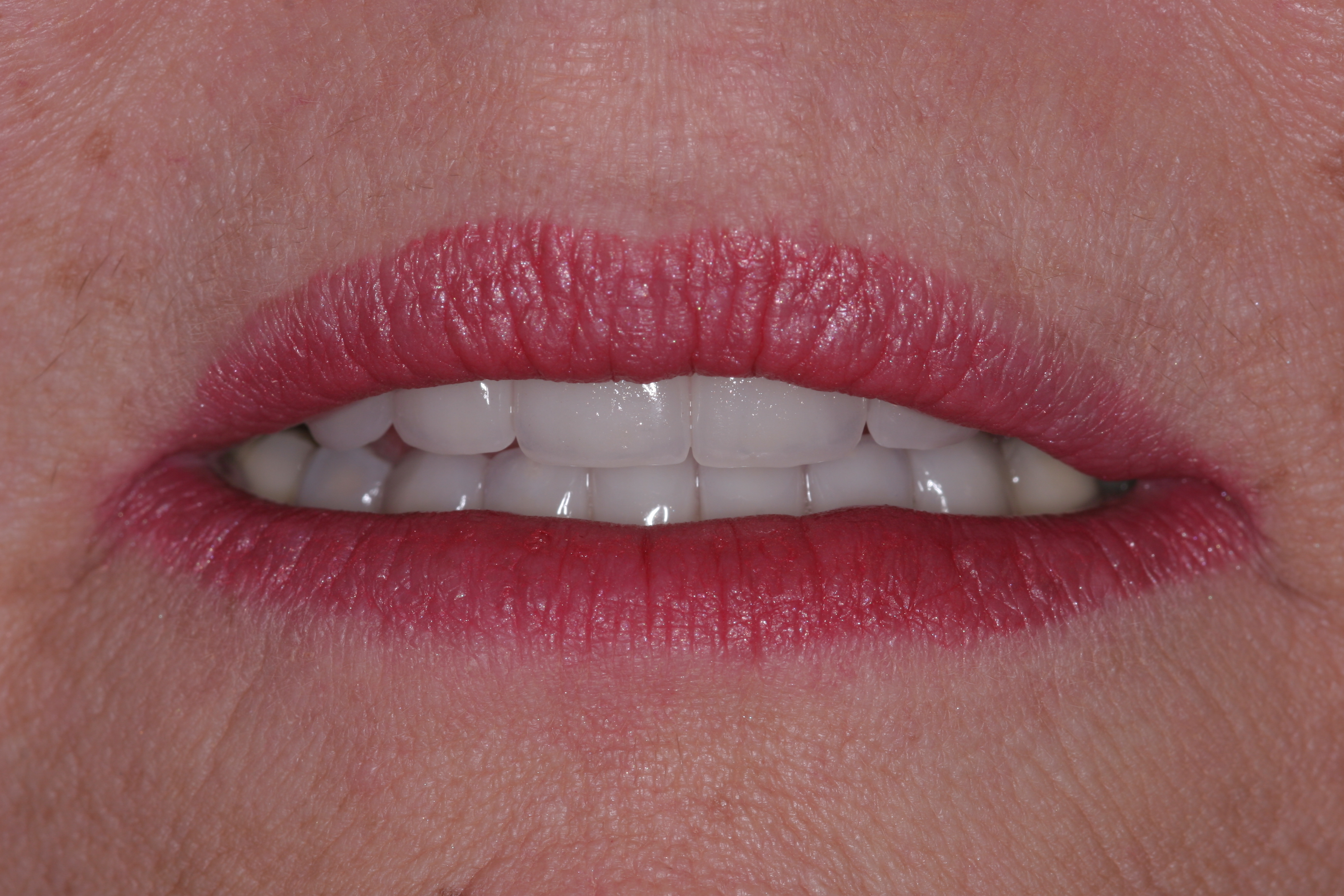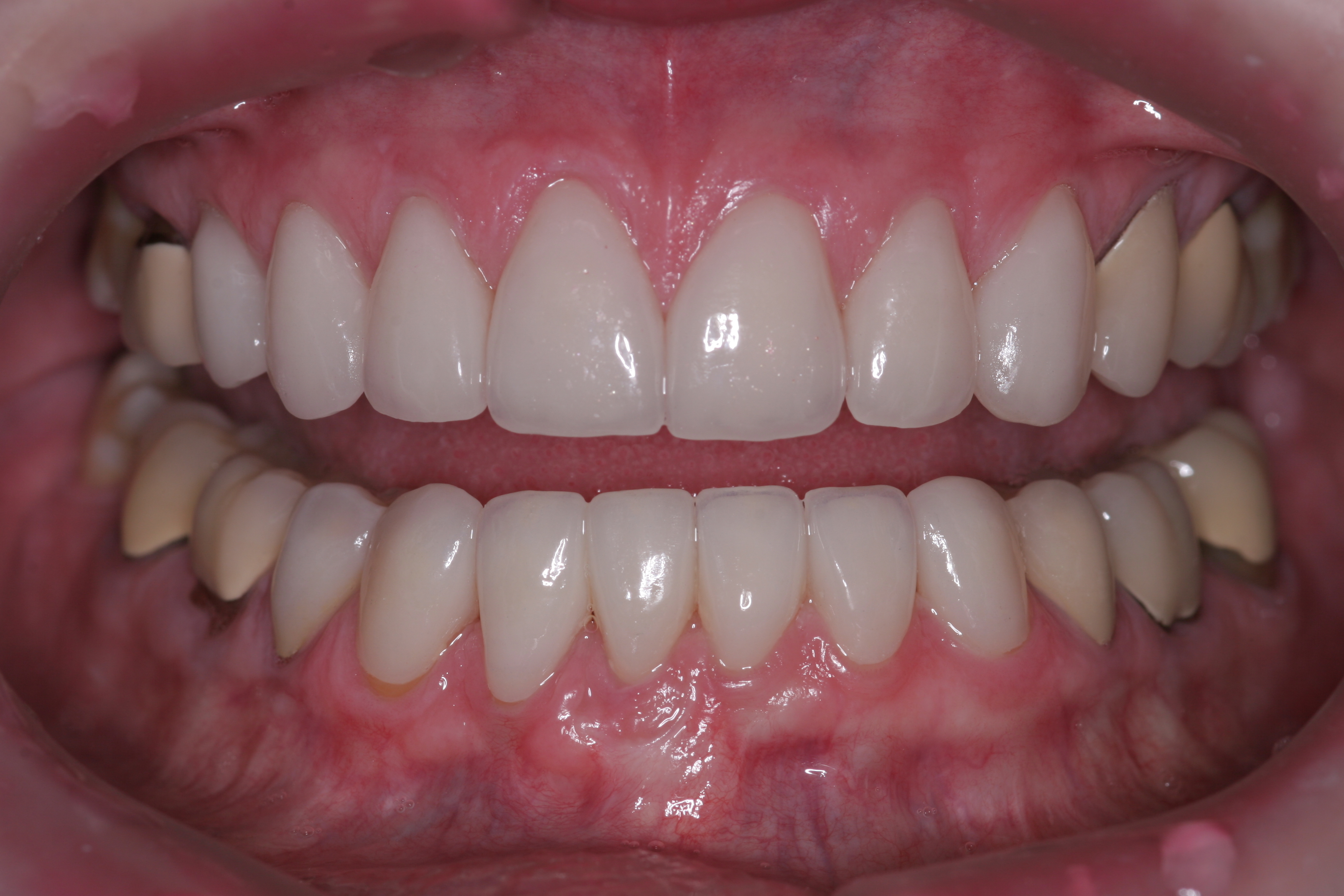 Treatment for this patient included posterior reductive equilibration and additive anterior equilibration (restoration) to eliminate the CR/MIP interferences and to meet the requirements of occlusal stability. Teeth Nos. 5 through 11 and 22 through 27 were prepared for full-coverage lithium-disilicate restorations. Crestal bone heights were evaluated. Soft-tissue crown lengthening was performed on the maxillary anterior teeth by a soft-tissue diode as needed. The esthetic, functional, and phonetic changes were evaluated and confirmed in the provisional restorative phase (Figure 17 through Figure 21).