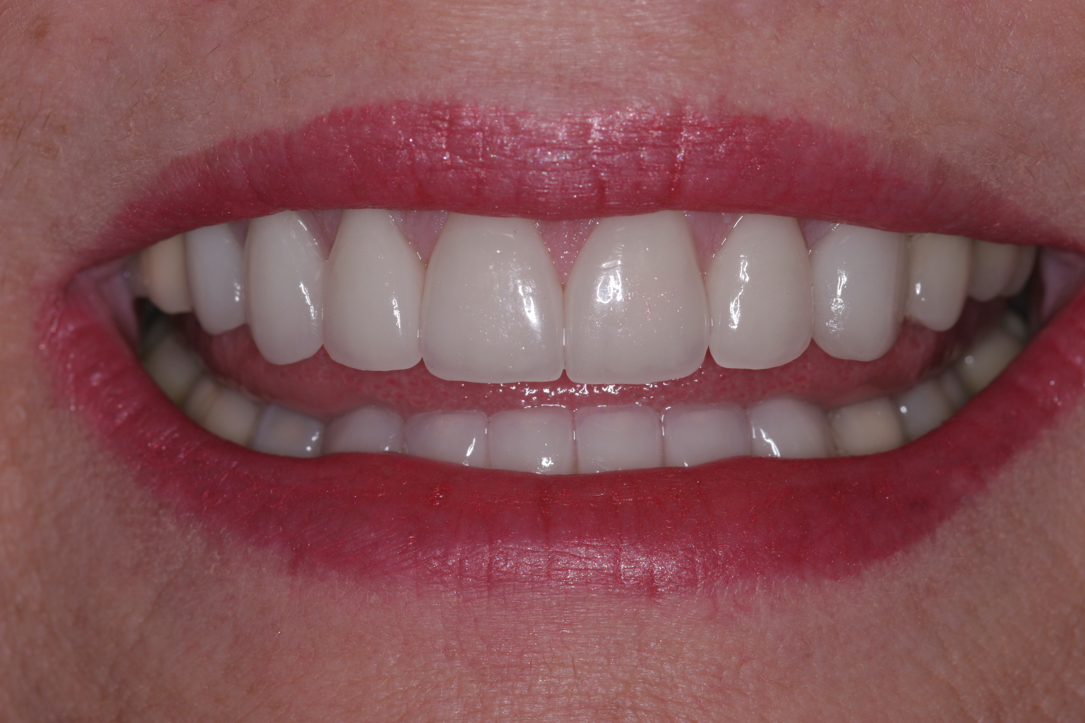 A patient presented with advanced generalized wear of her anterior teeth (Figure 10 and Figure 11). She was displeased with their overall appearance because of their color and wear (Figure 12). A complete examination was performed, revealing instability in her temporomandibular lateral poles bilaterally, sore muscles of mastication, advanced wear, a CR/MIP discrepancy, and loss of her anterior guidance due to the wear. Although the topic is beyond the scope of this article, the patient was also screened for possible sleep apnea. This included an evaluation of the Mallampati score, previous sleep therapy evaluation or treatment, snoring history, an evaluation of her neck size, her weight status, and the presence of the tonsils and their size. In every case, if this clinician suspects airway obstruction to be playing a role in tooth wear issues, the patient is referred to a sleep physician. The patient in this case displayed few apnea risk factors, and the patient’s anterior wear facets fit together like a “lock and key” pattern seen in parafunctional activity. Splint therapy was initiated to stabilize the joints and muscles. A repeatable CR position was verified through load testing. At this point diagnostic models, photographs, a CR bite record, and a facebow were taken and recorded.