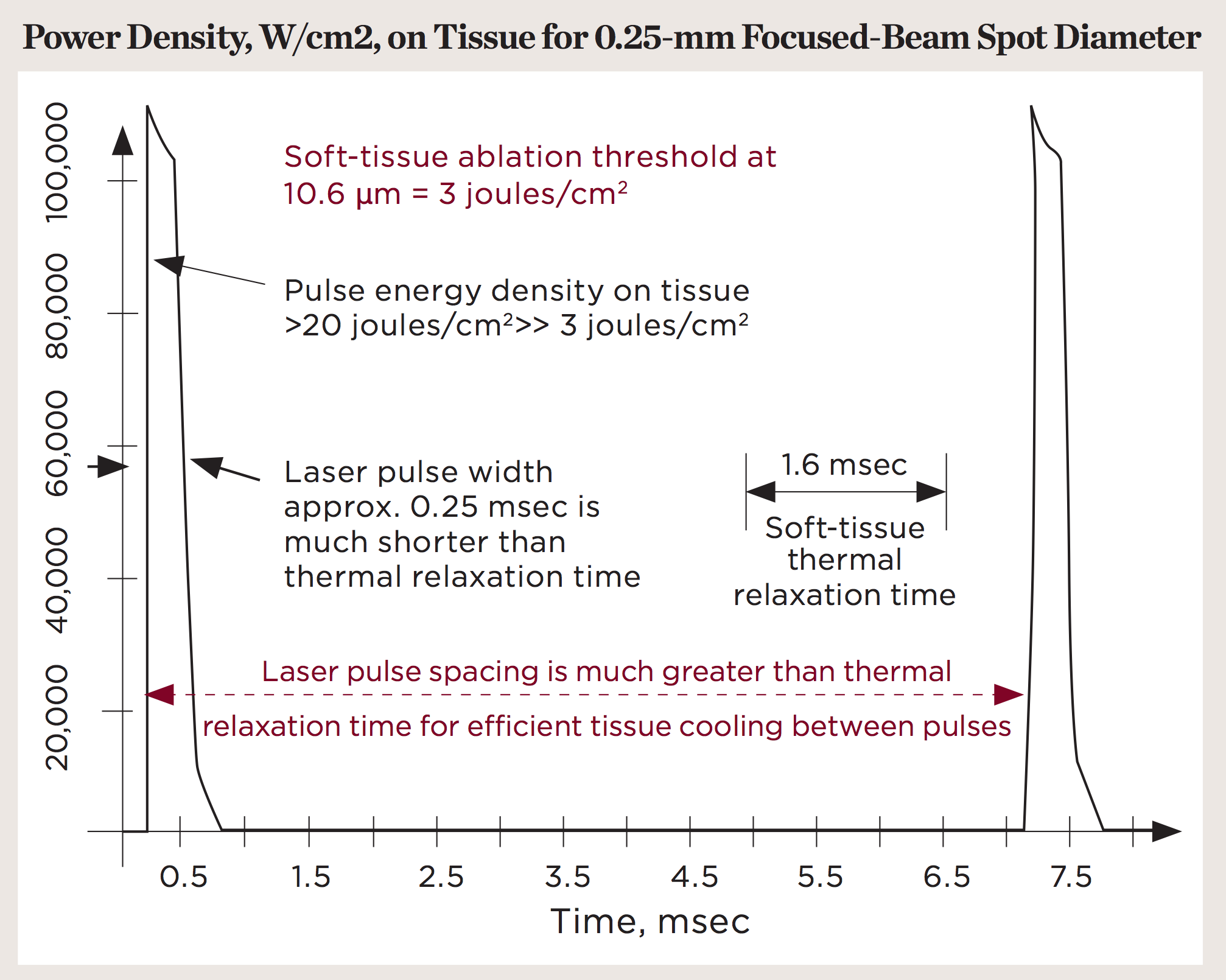 Laser pulsing is as important as wavelength; for cutting, short and powerful pulses are superior to long and weak ones. In the physics of pulsed laser surgery, thermal relaxation time is an important concept.11,12 Thermal relaxation time depends both on the tissue’s light absorption coefficient (Figure 1) and the tissue’s thermal diffusivity, as first described by Einstein.14 The irradiated tissue is vaporized with the highest efficiency if the thermal relaxation time is much longer than the pulse duration. The most efficient cooling of the tissue adjacent to the ablated zone is achieved when the period between laser pulses significantly exceeds the thermal relaxation time. Such laser pulsing specifications are referred to as a super pulse. A super pulse (Figure 3) minimizes collateral thermal damage, which makes it an essential feature of any state-of-the-art soft-tissue surgical CO2 laser.11 The optimal combination of the CO2 laser wavelength and these specific pulsing parameters ensures char-free, scar-free, and bloodless surgery with uncomplicated healing.