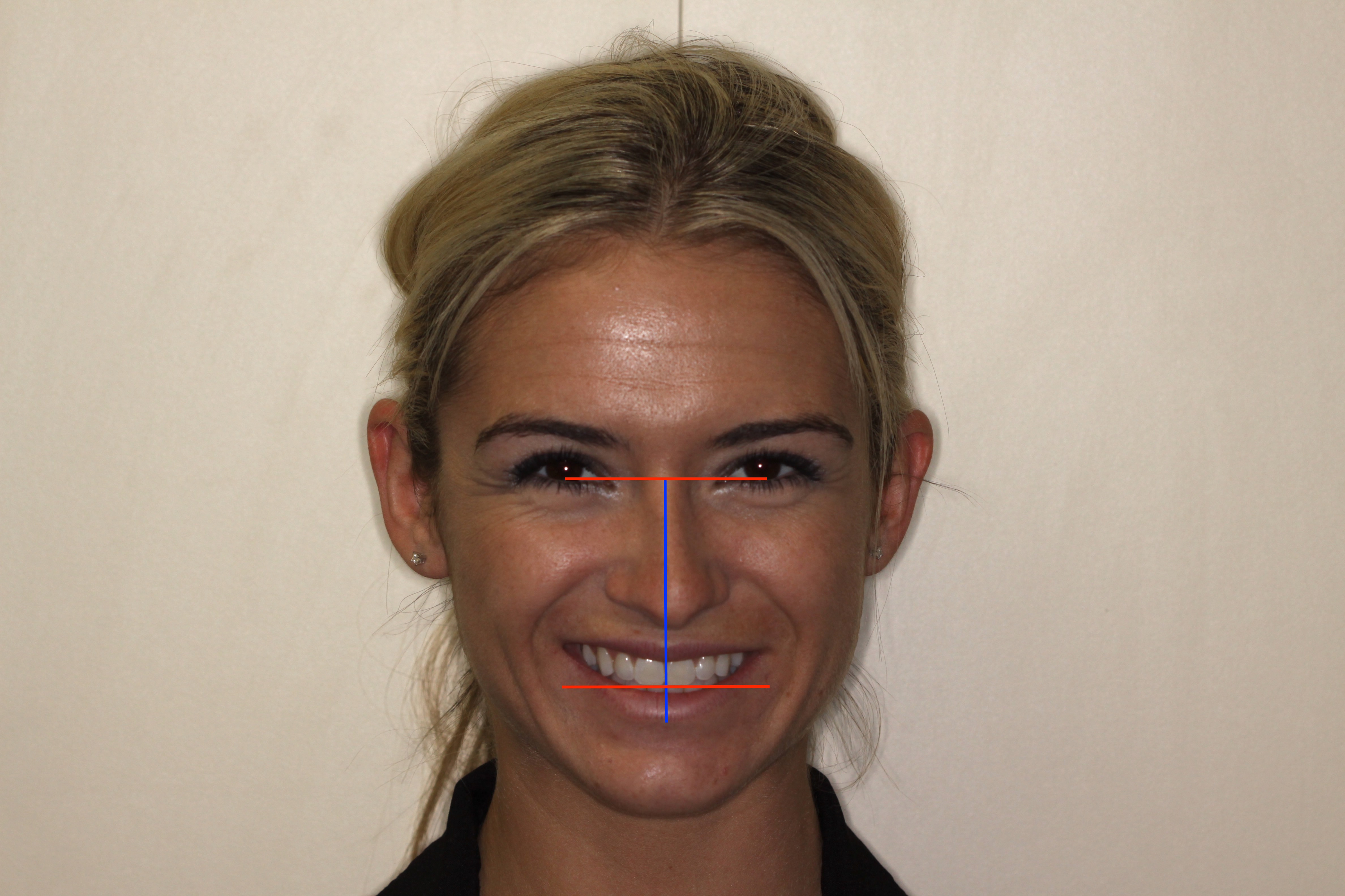 The facial midline can be used as the starting point of esthetic smile design.3 A correctly placed facial midline is critical for the success of a natural looking outcome. However, some confusion remains regarding the best techniques for reliably locating the facial midline.4 The full-face smile photo is important to record the prominent facial anatomy, but even using these facial landmarks can be deceptive in determining proper midline placement. Many people have facial anatomy (eg, noses and chins) that deviate from the midline, which diminishes the reliability of using the nose and chin as the only landmarks in assessing midline placement.5