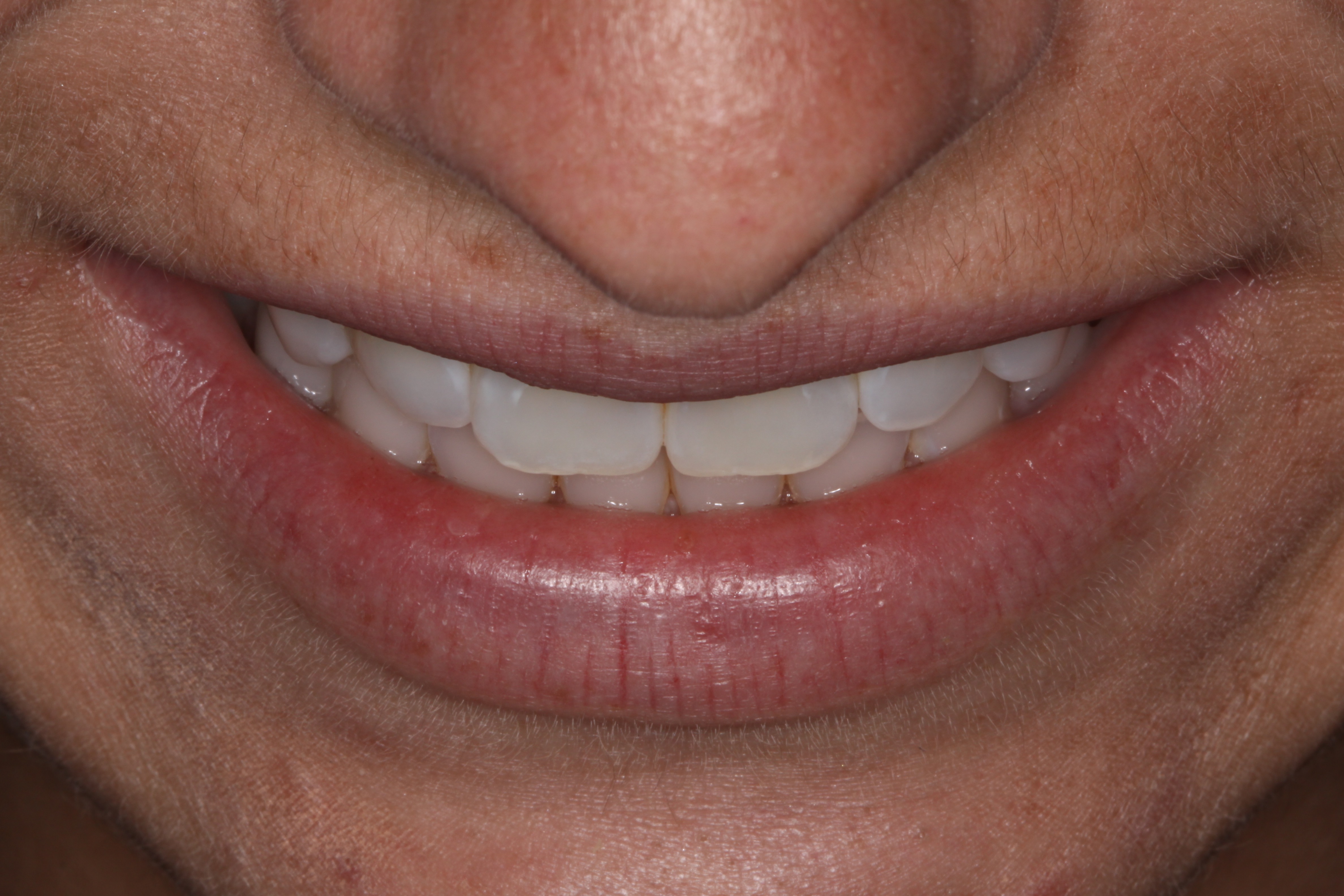 The tip-down smile photo will help the restoring dentist assess the maxillary incisal edge in relation to the lower lip on a horizontal plane. This photo is taken from a 45° angle from the occlusal plane.1 The tip of the nose is typically in this photo, but if the nose blocks the view of the incisor then the photo was taken at too steep of an angle. The purpose of taking this photo is to analyze the incisal edge position compared to the lower lip. It will assist the restoring doctor in balancing the function and esthetics of the maxillary incisal edge position.18 The maxillary incisal edge should land on, or point towards, the vermilion border (wet/dry line) of the lower lip (Figure 5). If the incisal edge is too buccal, then it will land on the dry tissue of the lower lip and can lead to the restorations feeling “bucked” to the patient. This can also lead to phonetic concerns.
