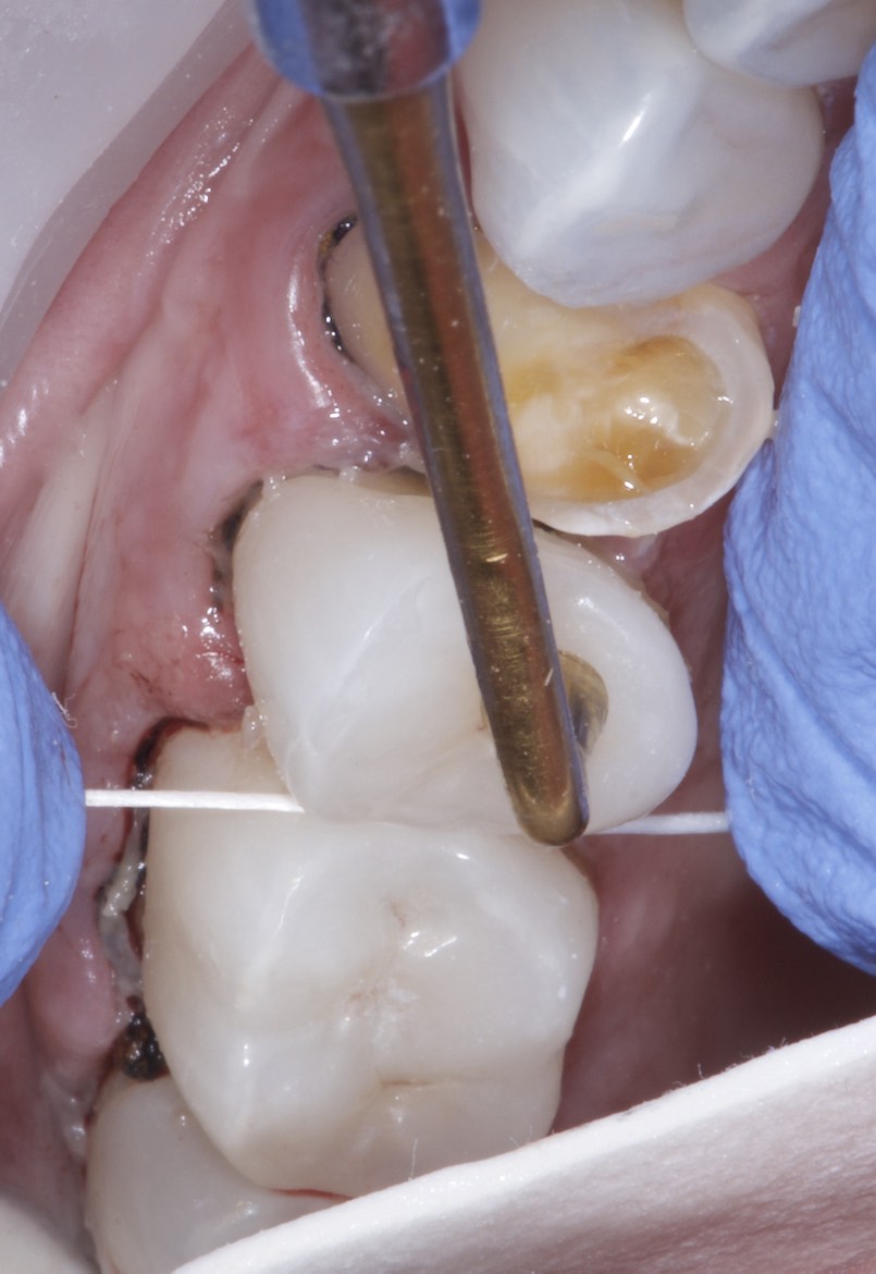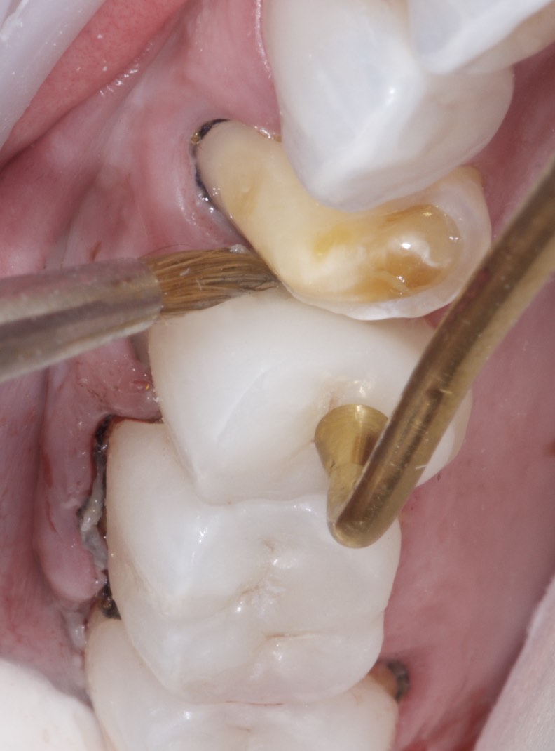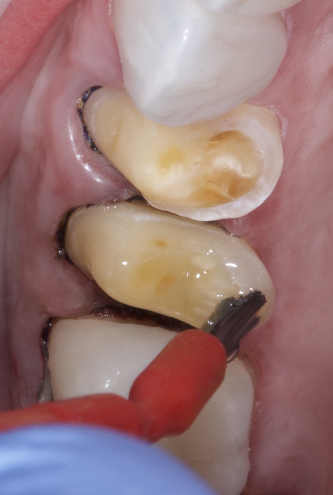 The abutment tooth is treated with a bonding agent as recommended by the manufacturer. Only dentin bonding agents specifically indicated for indirect restorations should be selected, as many self-etch adhesives are limited to direct restorations due to their increased film thickness and photopolymerization.15
