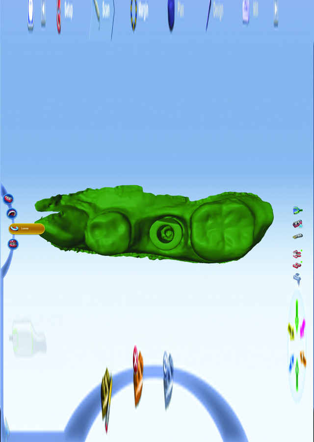 A Planmeca PlanScan scanner (Planmeca CAD/CAM Solutions, planmeca.com) was used to take a preoperative scan before removing the existing PFM No. 19, in order to fabricate a provisional restoration. Following removal of the PFM, the existing solid abutment was removed and replaced with an intraoral scan body (Straumann). Digital impressions were taken of the lower (Figure 2) and upper quadrant, after which the scan body was removed and a buccal bite scan was created with the teeth in occlusion. The previous solid abutment was then replaced and a provisional restoration was fabricated.