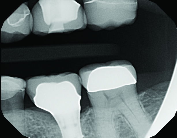 Thanks to the digitization of the final abutment, a monolithic e.max restoration was designed, milled, and ready for delivery prior to the office receiving the custom abutment. Upon delivery, the provisional restoration and solid abutment were removed. The new custom abutment was tried-in, along with the new e.max restoration to verify fit and occlusion. After the restoration was conditioned with Monobond Etch & Prime (Ivoclar Vivadent), the abutment was torqued to 35 Ncm, Teflon tape was placed in the screw access, and the restoration was cemented with SpeedCem (Ivoclar Vivadent) (Figure 5). Equigingival margin placement generated by the custom abutment design ensured thorough removal of excess cement. A post-operative radiograph was taken (Figure 6).