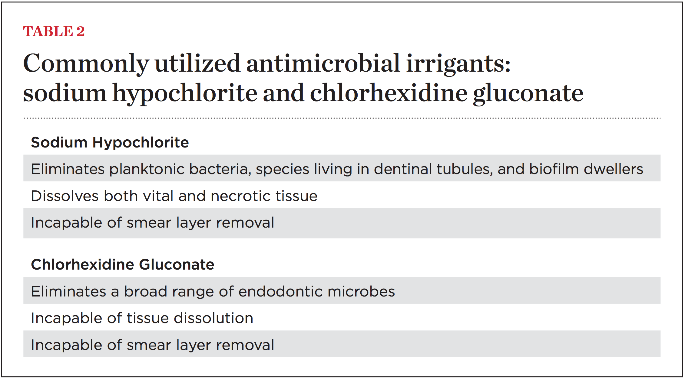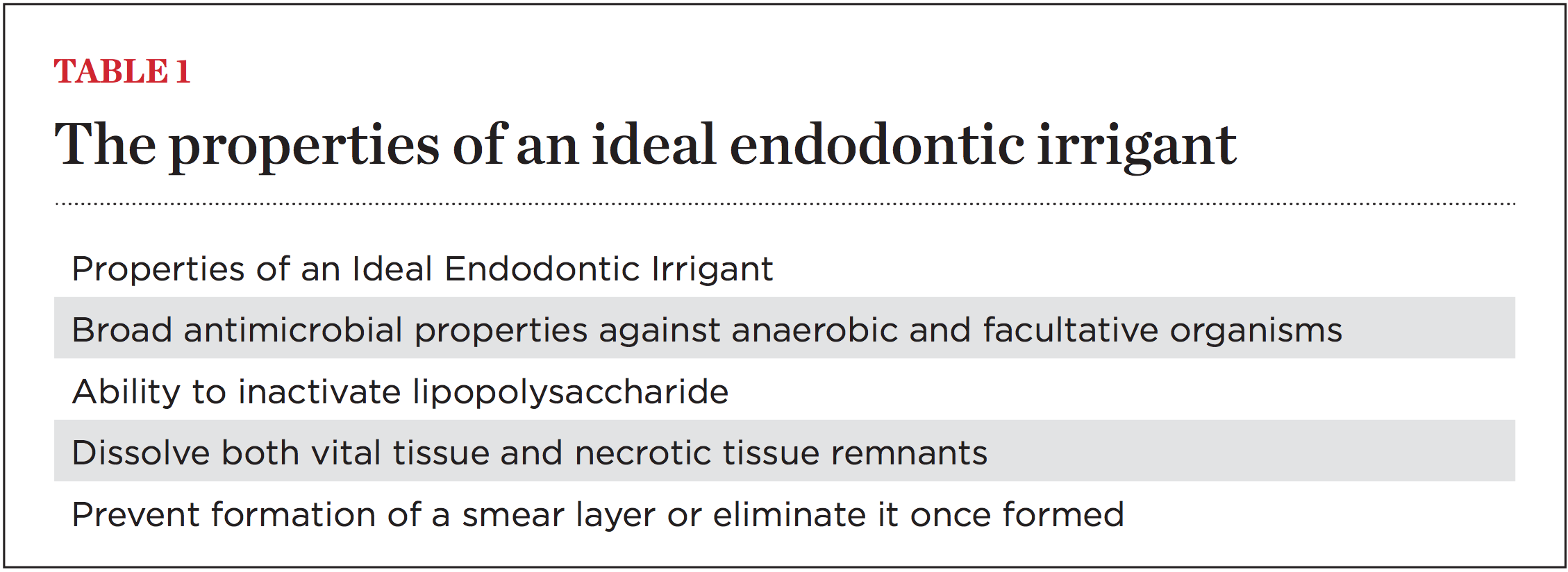 Root canal irrigants are liquids that both flush the root canal system of debris and eliminate microbes. Ideal irrigants possess broad antimicrobial properties against both anaerobic and facultative organisms, inactivate lipopolysaccharide, dissolve both vital and necrotic tissue remnants, and either prevent the formation of a smear layer during instrumentation or effectively remove it once formed.7 These properties are summarized in Table 1. Unfortunately, no single liquid irrigant possesses all of the above properties. Accordingly, many practitioners employ several irrigants during root canal therapy to take advantage of their varied properties.
