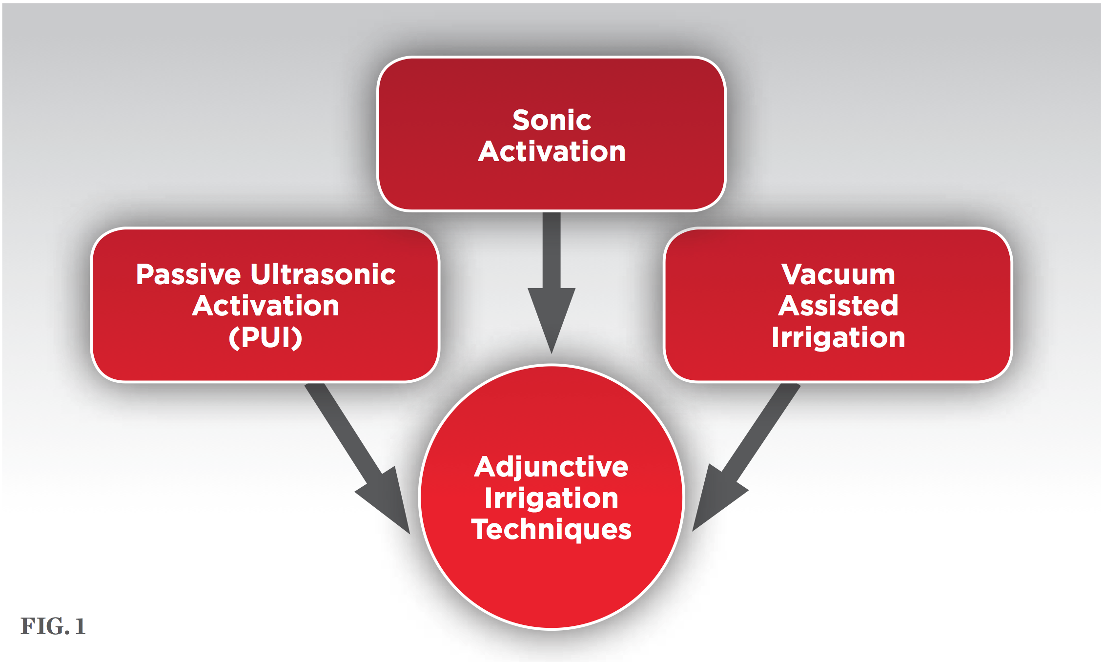 Several adjunctive irrigation techniques beyond simple syringe irrigation were developed in order to offer improvements in disinfection, debridement, or both with known irrigant solutions. These adjunctive techniques include vacuum-assisted irrigation, passive ultrasonic irrigation (PUI), and sonic activation (Figure 1). At this time, 45% of AAE members report using one or more of these techniques during root canal therapy.11 While research certainly justifies the use of some of these techniques to eliminate microbes, other techniques prove less effective. Vacuum-assisted irrigation, like that from the EndoVac™ system (Kerr Corporation, www.kerrdental.com), while improving canal debridement, offers no improvement in microbial reduction and should not be relied upon for these purposes.20 PUI, on the other hand, improves both debridement and disinfection. One study found PUI was as effective as a final rinse with CHX in eliminating bacteria.20 Lastly, sonic activation, like that offered by the EndoActivator® (Dentsply Sirona, www.dentsply.com), is as effective as PUI.21 Given these findings, clinicians may want to consider using one or more of these techniques during treatment.