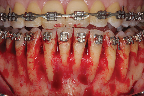 Jeopardizing the surrounding periodontium: The use of CAO has been thought to jeopardize the overall periodontal condition because of flap opening and cortical bone reduction.60 So far, the literature has reported no adverse effect on CAO use toward the surrounding periodontium.43,61 Furthermore, it has been shown that CAO actually reduced the mean pocket depth by about 0.2 mm to 1.5 mm when compared to sites that did not receive treatment with CAO.35 In addition, some have reported that CAO use increases the dentoalveolar bone width10,62 and the zone of keratinized tissue height.63