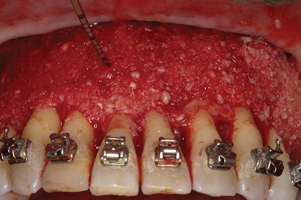 Based on Frost’s work14 with bone healing and his descriptions of the regional acceleratory phenomenon (RAP) during fracture healing, the Wilckos proposed several critical concepts explaining the mechanism by which teeth move faster after corticotomy.10 They found that the alveolar bone following a corticotomy loses structural integrity as a result of a transient demineralization.15 They described the healing as a soft collagenous bone matrix that remained within the dentoalveolar segment and facilitated the orthodontic transportation of the teeth. In addition, this matrix was the source of remineralization when the tooth was retained in its final position. Thus, the healing pattern for accelerated tooth movement caused by the corticotomy and dentoalveolar decortication surgical insult is coupled with the demineralization–remineralization process. This has been well confirmed in a rat model.16 This phenomenon of a “bone matrix transportation” was described because the teeth do not actually move through the dentoalveolar bone segment as with conventional pressure-tension orthodontia, but instead they move with the dentoalveolar bone segment that is being displaced in total during its demineralized state.17 Figure 12 demonstrates particulate bone grafting after corticotomy and dentoalveolar decortication as a part of the SFOT approach. Figure 13 and Figure 14 show cross-sectional cone-beam computed tomography images of tooth No. 6 before and after SFOT. When seen together, the images demonstrate improved incisor angle position and axial inclination of the cuspid as well as a significantly improved dentoalveolar bone volume post-treatment.