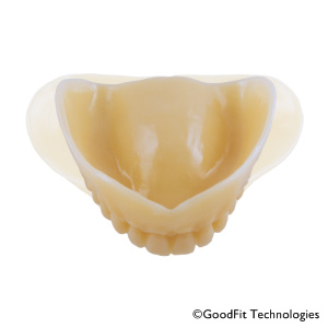 A transitional system that was introduced prior to a completely digital denture workflow is the Good Fit™ impression system, which utilizes moldable PMMA trays that can be custom fit to a patient’s mouth (Figure 6). This allows the dentist to construct a type of custom tray that ensures proper borders and soft tissue impressions. The trays can be adjusted to allow the proper vertical dimension and occlusion plane as well as establish centric relation. This system is intended to combine all the initial steps of a traditional denture workflow. The results are sent to the laboratory for denture set-up and all the remaining steps.6