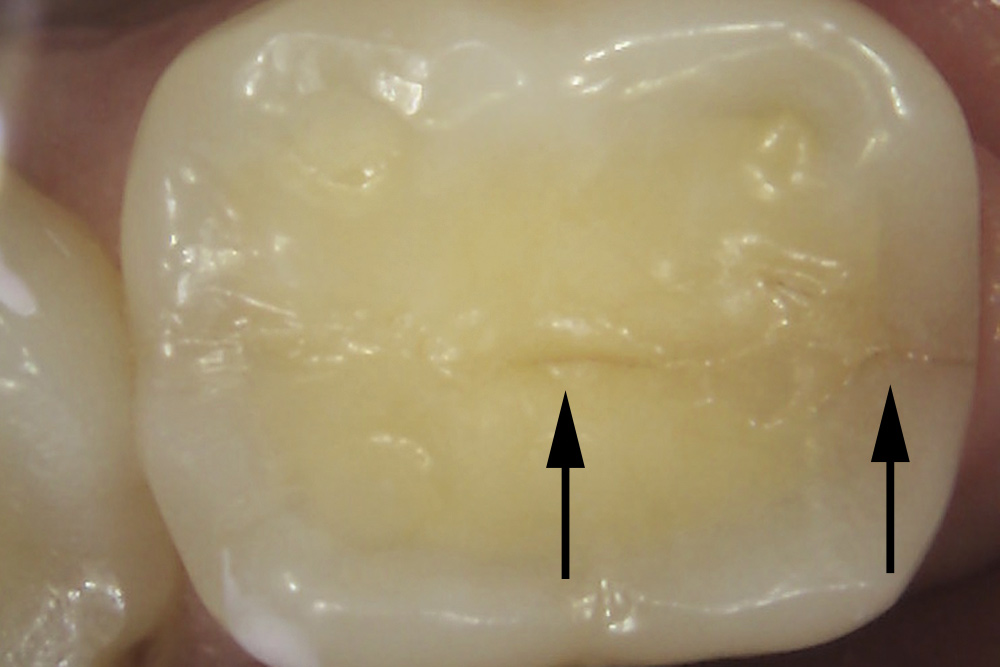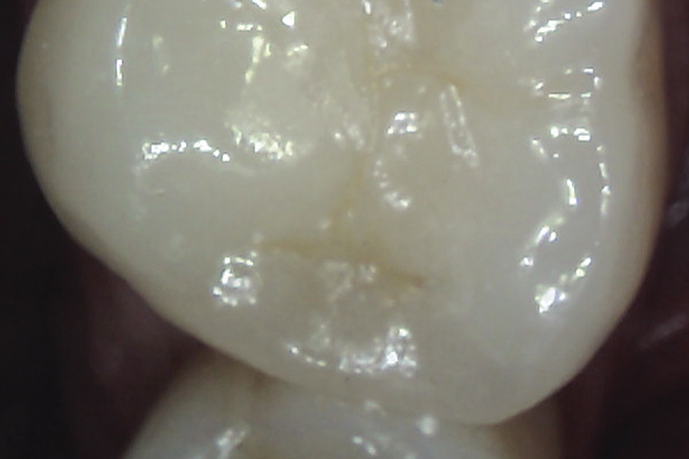 Similar to diagnosis, the treatment of asymptomatic cracks can be incorporated into the comprehensive treatment of the dentition. Treatment begins by evaluating and treating asymptomatic vertical enamel cracks. In a recent study in which intraoral images of enamel cracks were projected on a screen to ensure the uniformity of referenced cases, 80% of the 51 participating general dentists indicated they would recommend treatment for asymptomatic enamel cracks.19 However, which enamel cracks are considered significant, requiring intervention, and which are less significant, requiring only monitoring and preventive measures, is still not clearly standardized. Monitoring should be used with caution because 27% of cracked teeth observed in the aforementioned Northwest Dental Practice-Based Research Network study showed progression in just 1 year.11 This is primarily due to the complex and multifactorial etiology of cracks that weakens tooth structure, such as large cavity preparations and incomplete developmental fusion of areas of calcification, as well as exertion of damaging forces on teeth from such sources as horizontal occlusal forces, bruxism, and masticatory accidents.24