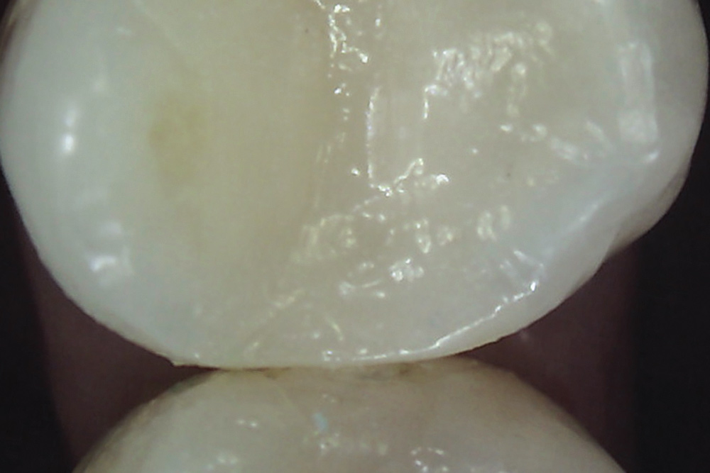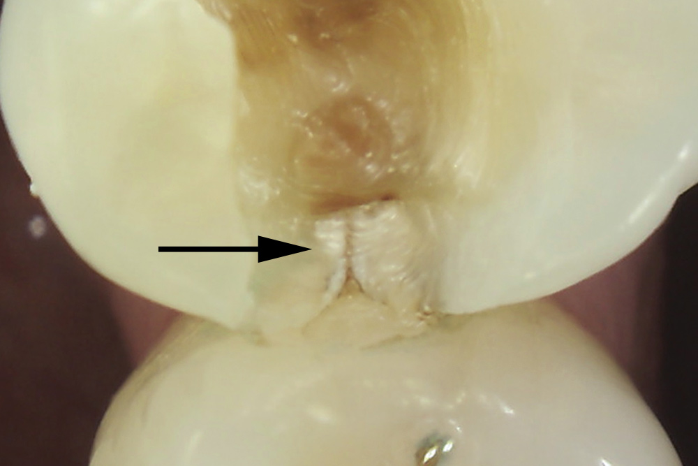 In a study in which intraoral images of dentin cracks were projected on a screen to ensure the uniformity of referenced cases, 74% of the 47 participating general dentists who treat asymptomatic dentin cracks recommended occlusal coverage restorations for both stained and unstained asymptomatic vertical dentin cracks.19 The choice of dental materials and the specific designs of occlusal coverage restorations used in the treatment of asymptomatic dentin cracks depend on each tooth’s additional needs, the clinician’s preferences, and the specific functional and esthetic needs of each patient, as long as the aforementioned objective of immobilizing the cracked segments of the tooth on loading is achieved. However, cracks can still propagate under restorations due to their multifactorial etiology, as described earlier. Thus, placing bonded occlusal coverage restorations with a ferrule effect and reducing occlusal stresses, along with early intervention, will help to ensure better long-term treatment outcome.