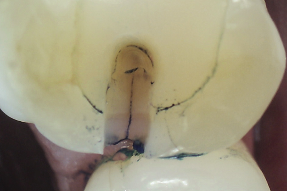 The current diagnostic tools cannot determine the full extent of cracks without intervention, and significant enamel cracks do not always indicate the presence of underlying dentin cracks.2,14 A definitive treatment plan for the type of final restoration, especially in the case of occlusal coverage restorations, generally cannot be made preoperatively based on the initial clinical impression of the enamel crack if the tooth is otherwise not compromised except for the enamel crack. An exploratory fissurotomy and/or removal of the existing restoration and caries is still needed first to verify the extent of the enamel crack and determine the condition of the remaining tooth structure.