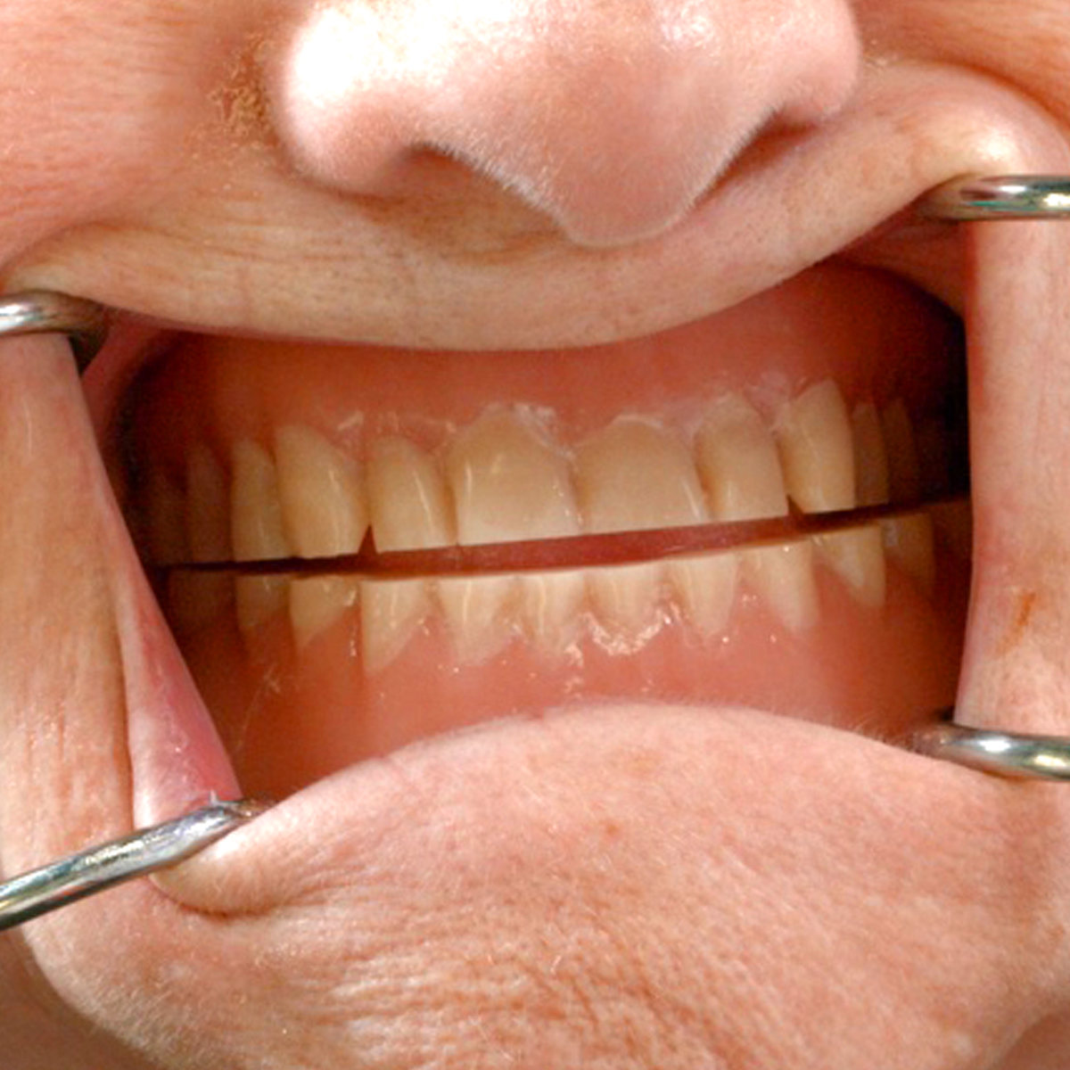 Residual ridge resorption and wear of the prosthetic teeth are noted to be the two major causative factors for lost vertical dimension of occlusion (VDO) in complete denture wearers.1,5-7 A reduced VDO may result in poorly conditioned tissues that are incapable of providing adequate support to the prosthesis. Other possible results of a reduced VDO include reduction of lower face height, compromised facial esthetics, an acquired Class III maxillomandibular relationship, angular cheilitis, and temporomandibular joint (TMJ) sounds on auscultation.8 Habitual mandibular posturing and altered neuromuscular programming in patients presenting with an insufficient VDO may cause difficulty in registering an accurate maxillomandibular relationship (Figure 1).9 Therefore, it is extremely important to reestablish an esthetically appropriate and functional VDO prior to the definitive therapy.9 Patients with a collapsed VDO may need to be reprogramed with an orthopedic device (which can maintain the mandible at an increased VDO) so that they can adapt to a new jaw separation position.1,9 It is important to improve the fit of the existing dentures and the health of the intraoral tissues before fabrication of the orthopedic device. A tissue conditioning material can be used to help restore the health of the denture bearing tissues (Figure 2).10