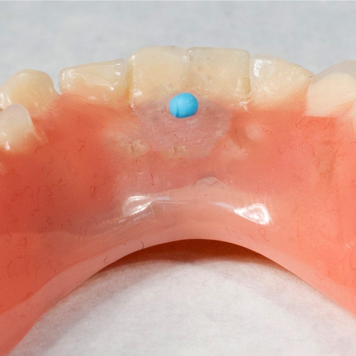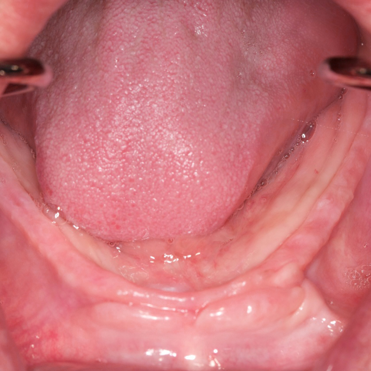 Tongue position is important to maintain stability of the lower denture and develop the proper length of the lingual flange.23 Tongue positions may be classified as “normal” or “retracted” (Figure 12).23 A normally positioned tongue completely fills the floor of the mouth. The lateral borders rest over the posterior edentulous ridges, where they would normally rest over the occlusal surface of the posterior teeth, and the tip of the tongue rests on or is just lingual to the anterior ridge crest. This tongue position maintains the correct position of the floor of the mouth. Retracted tongue posture is demonstrated when the tongue is pulled back, exposing the floor of the mouth, and the lateral borders are either medial to or posterior to the edentulous ridge. In addition, the tip of the tongue is located in the posterior portion of the mouth or is withdrawn into the body of the tongue itself. Approximately 35% of patients present with retracted tongue posture.23 The prognosis of patients with a retracted tongue can be improved by making them aware of their condition and instructing them to position the tongue correctly during rest and function. Prescribing tongue exercises23 and placing a training bead of resin on the lingual aspect of the denture in between the central incisors24 can also help retrain the tongue and maintain its proper position (Figure 13 and Figure 14).