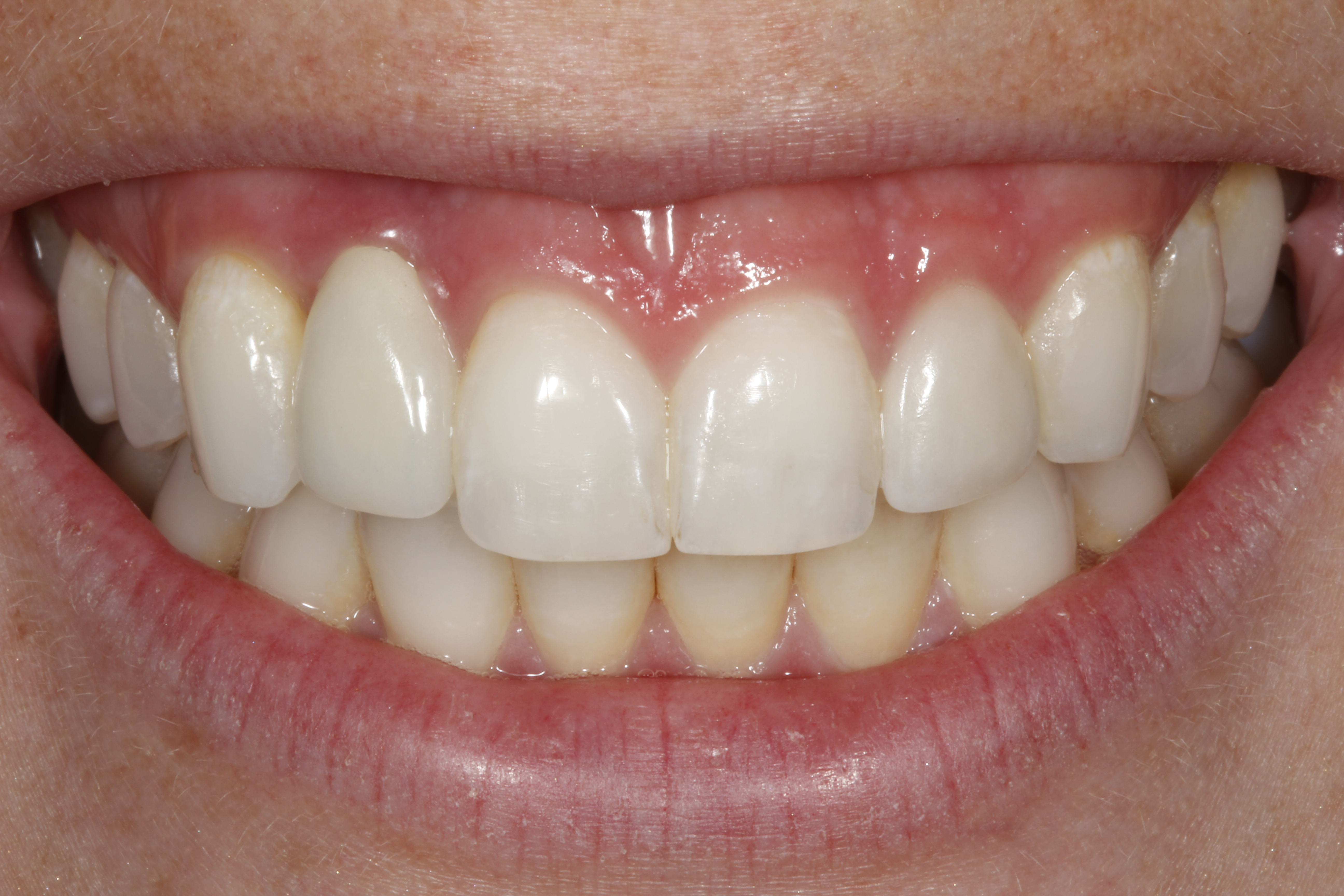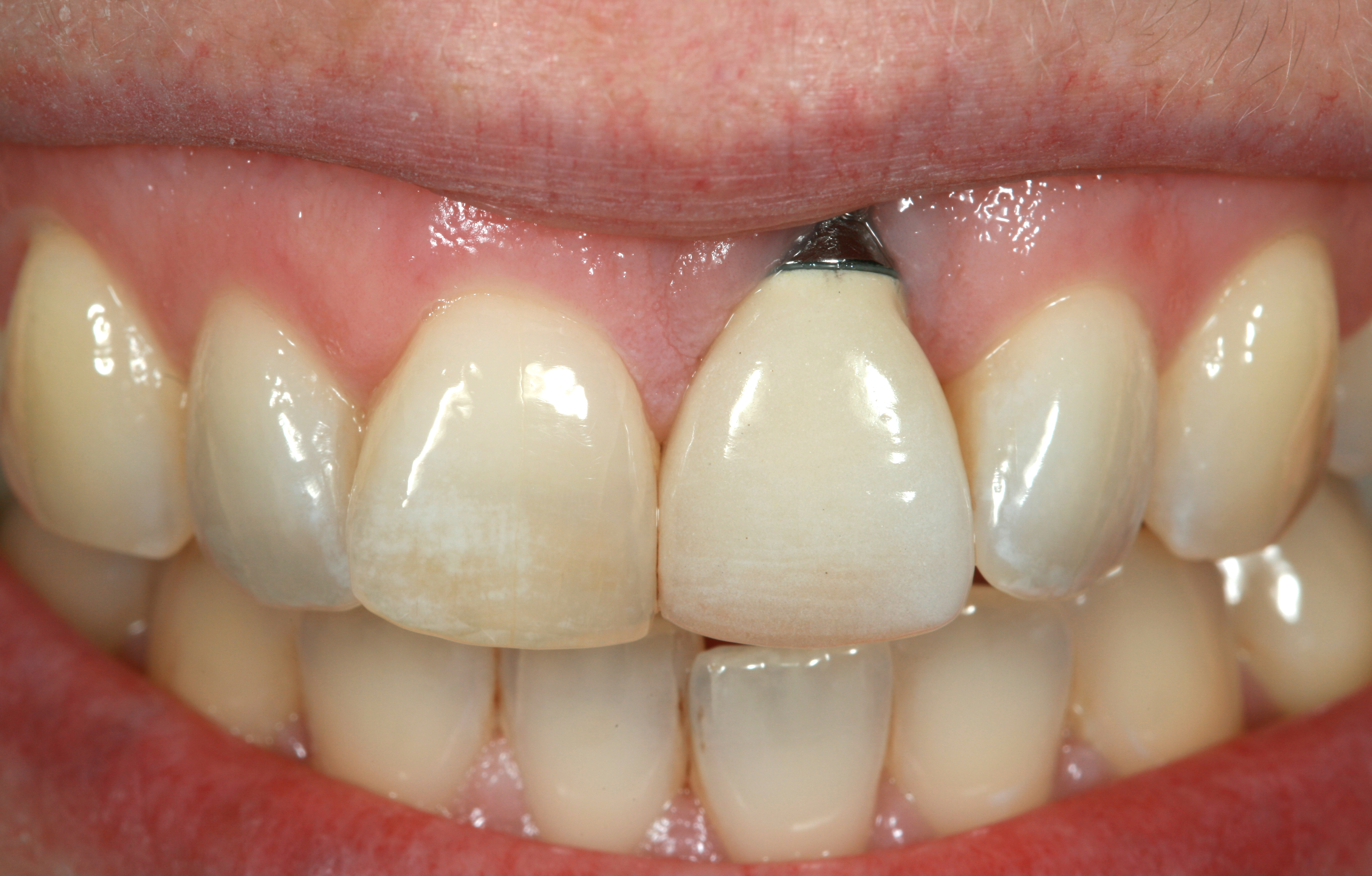 It was determined that additional augmentation was required to increase the soft-tissue volume, so a subepithelial connective tissue graft was acquired from the palate (Figure 8),23,24 placed, and allowed to mature for at least 3 months. Second-stage implant undercovering surgery with a palatal-biased incision was performed after tissue maturation to further thicken the labial soft tissues. In addition, a flat contoured healing abutment was placed to allow the soft tissues to mature without risk of recession, and the RBR replaced (Figure 9). After 4 to 6 weeks of healing, a flat contoured screw-retained provisional restoration was inserted (Figure 10) with the proper submergence profile to restoratively sculpt the soft tissues. An implant-level impression was made and the definitive cement-retained metal-ceramic restoration fabricated and inserted (Figure 11 through Figure 13). The final esthetic outcome to restore the proper length and proportion of the right lateral incisor to match that of the contralateral incisor was accomplished using the treatment steps outlined above, where the mucosal tissues were augmented after implant decoronation (Figure 14).