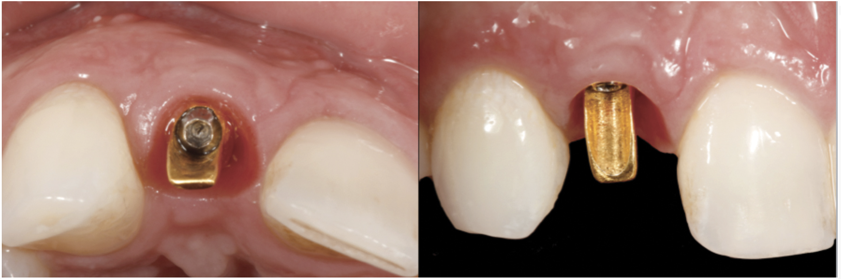 Problem: The implant is placed too facial with significant recession on the midfacial aspect of the abutment and/or crown; the implant is healthy and the patient has a high smile line with an intermediate to thick periodontal phenotype (Figure 1 and Figure 2).17-19