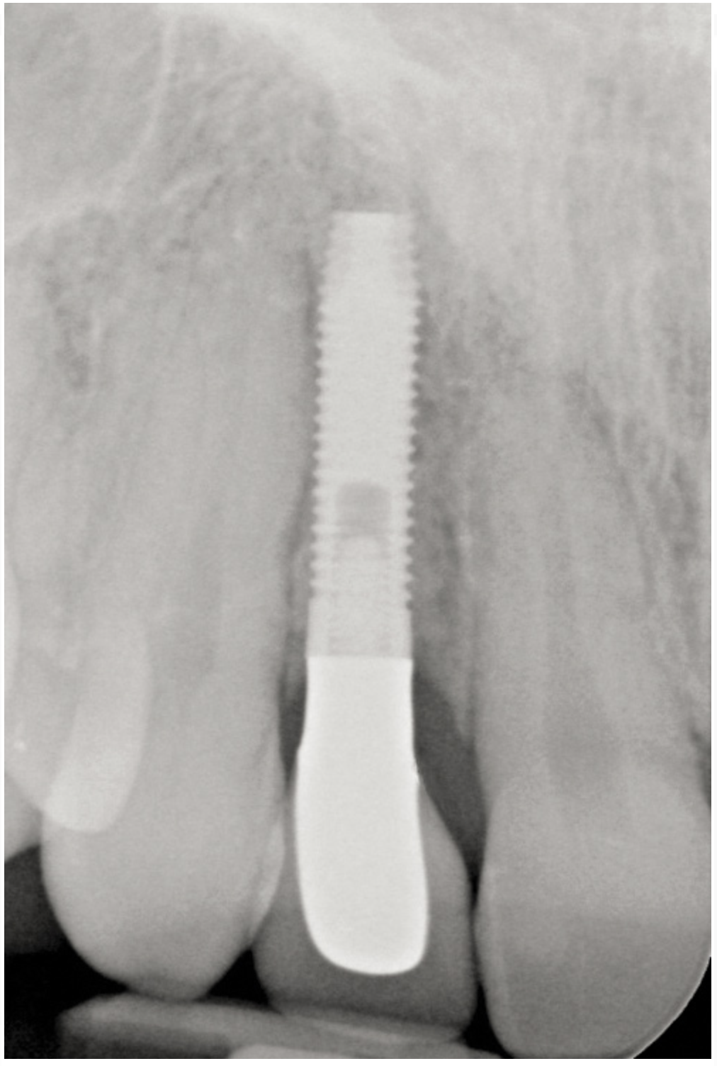 Solution: Using a reverse-torque device on high, remove the implant with minimal trauma to the surrounding periodontium. Let the area heal like an extraction socket and place a new implant in the proper position 8 to 10 weeks later. Restore the implant, which will now be in a better restorative and esthetic position, with either a screw- or cement-retained crown.