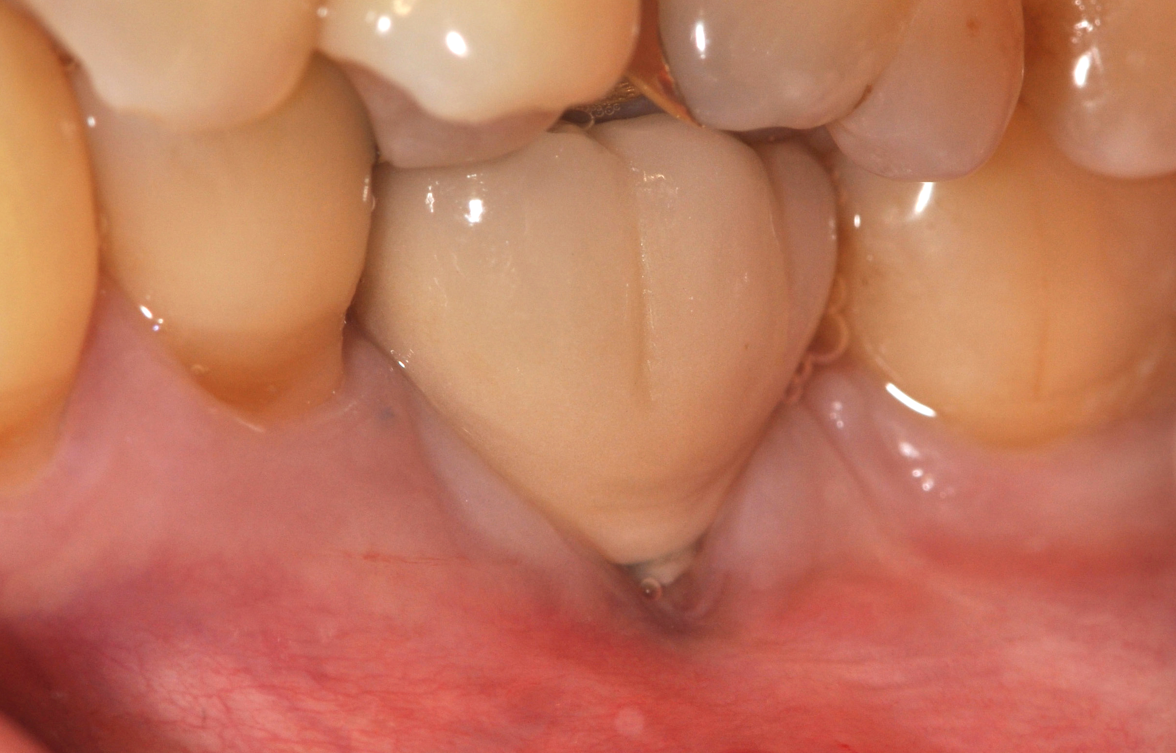 The following case report provides an example of this case scenario: A 55-year-old Caucasian female presented with a chief complaint of tenderness of 1-week duration around a single implant-supported crown in tooth No. 19 position; the implant and restoration had been placed approximately 2 years prior.