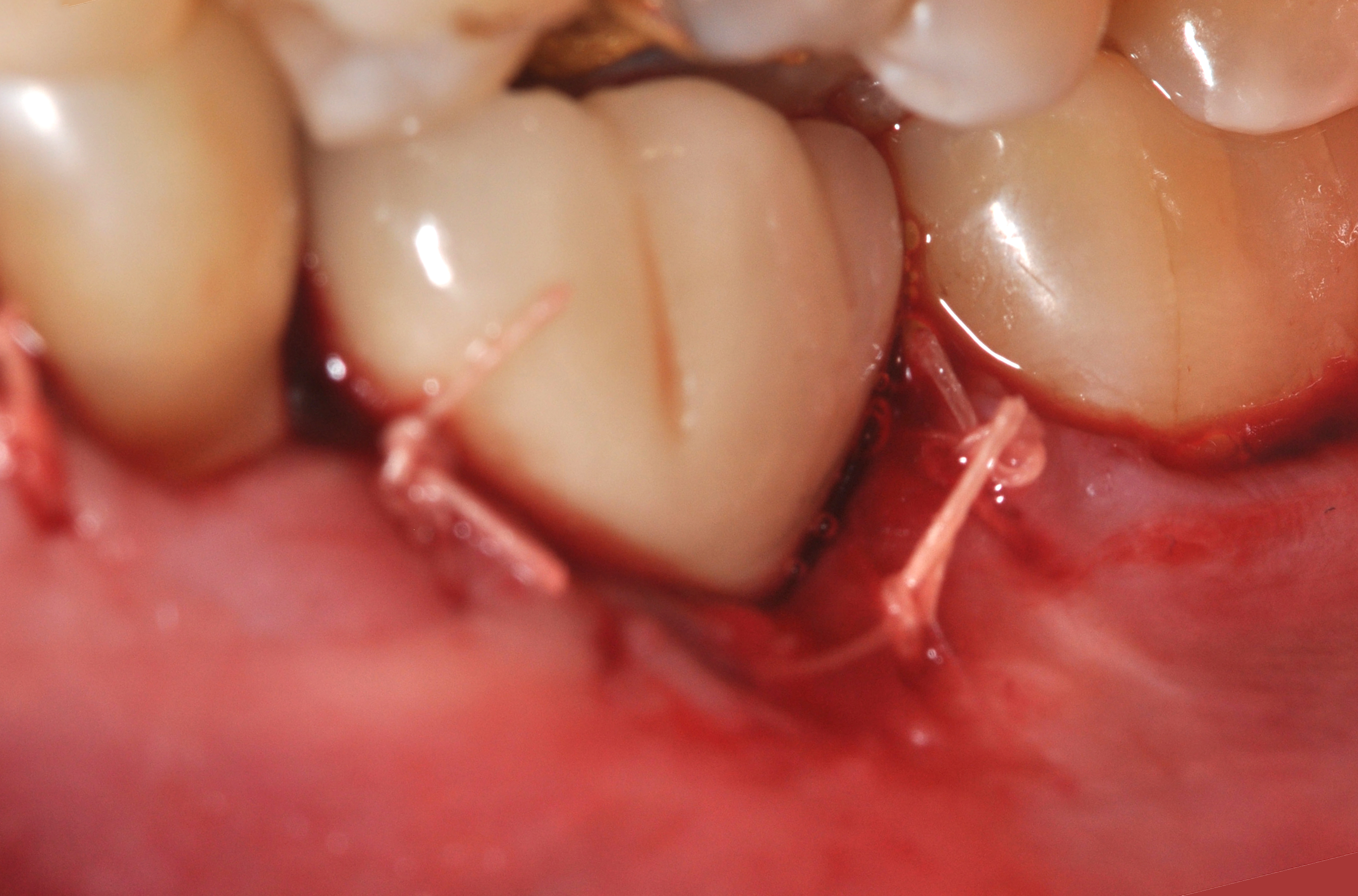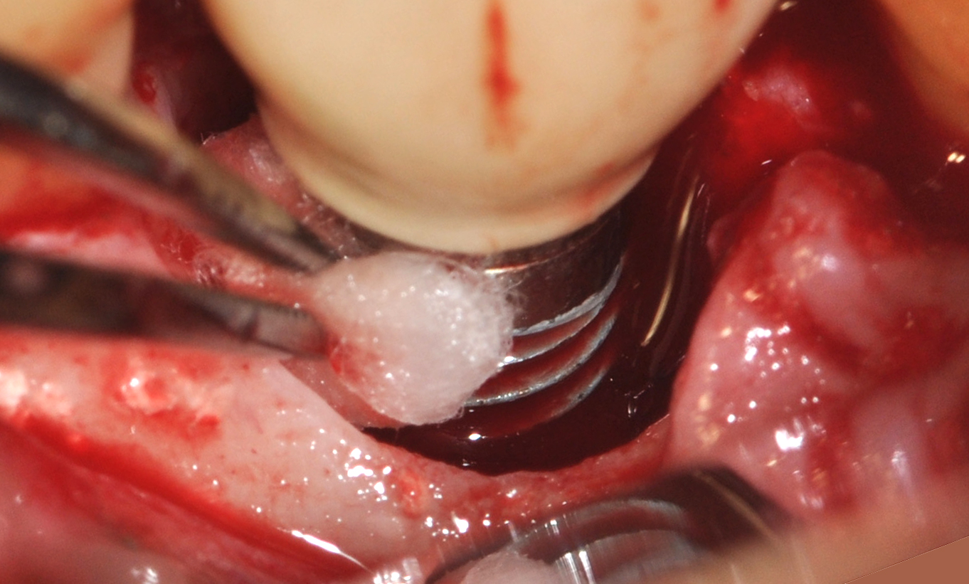 A surgical flap procedure was performed with the intent of thoroughly debriding the granulomatous tissue from the osseous defect (Figure 18 and Figure 19), mechanically and chemically detoxifying the surface of the implant (Figure 20 through Figure 22), and grafting the infrabony component of lesion with bone xenograft (Bio-Oss®, Geistlich Pharma, www.geistlich-na.com) in an attempt to reduce the vertical defect (Figure 23). To concurrently resolve the mucogingival problem, the plan called for placing a dermal allograft (Dermis Allograft, DENTSPLY International, www.dentsply.com) on the buccal (Figure 24) and then replacing the flap (Figure 25).