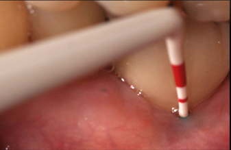 Clinical examination showed 2 mm of buccal recession with a shallow vestibule and absence of keratinized attached gingiva against the crown with 8 mm of circumferential pocketing accompanied by bleeding upon probing (Figure 15 and Figure 16). A periapical radiograph showed a symmetrical vertical osseous defect causing the loss of 50% of the bone around the implant (Figure 17). Because the patient had made a significant investment of time and finances to replace her lost tooth with the implant, she desired that the implant and restoration be retained, if feasible.