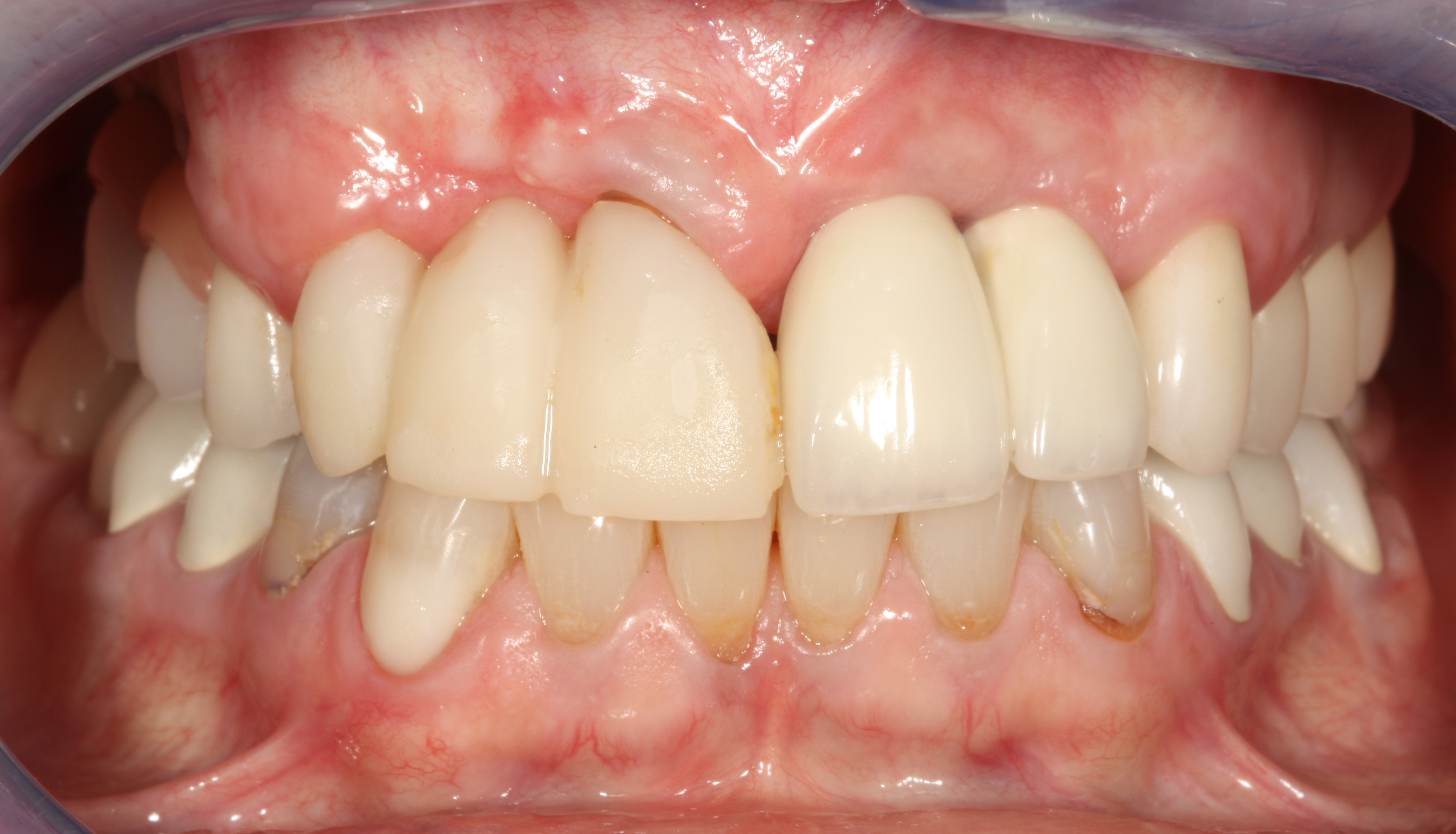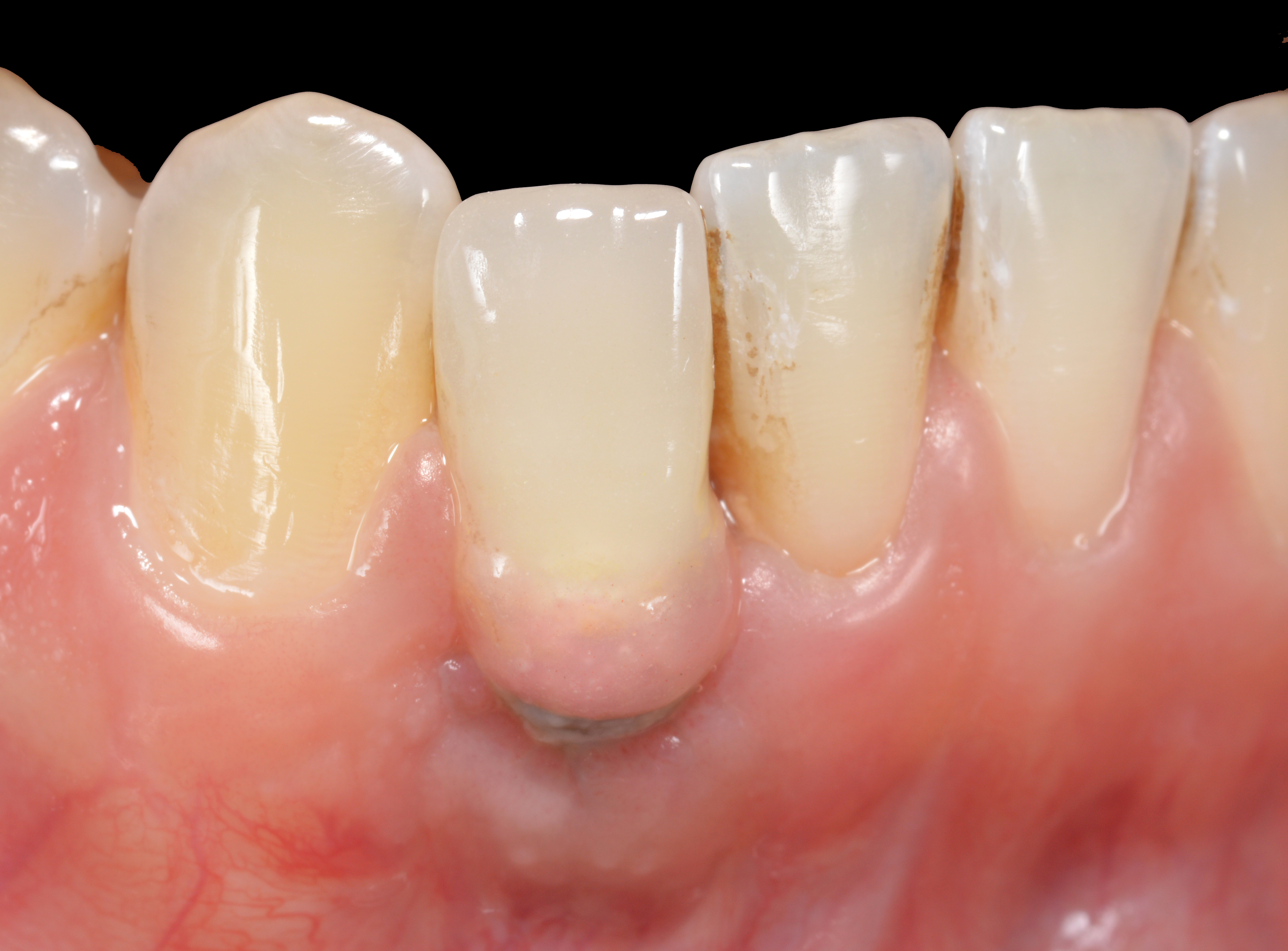 Problem: The implant is placed too facially, and there is significant labial gingival recession, contour change, and mucosal discoloration around the implant, abutment, and crown (Figure 3 and Figure 4). The implant attachment apparatus is intact and healthy, but the patient has a thin periodontal phenotype.
