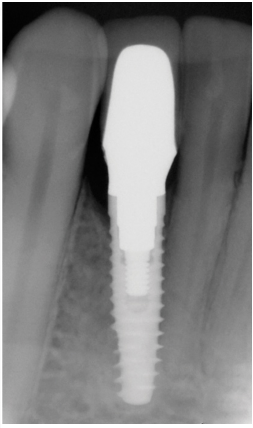 The resolution of the inflammatory aspect of the peri-implantitis lesion (Figure 26) was evidenced by 3-mm pocketing and an absence of bleeding upon probing. A 17-month follow-up (Figure 27) demonstrated resolution of the mucogingival problem, as evidenced by a deepened buccal vestibule, a zone of keratinized gingiva, and correction of the recession. A 17-month post-treatment radiograph (Figure 28) showed bone fill with elimination of the infrabony component of the lesion. Even with the close bone-to-implant approximation evident, a claim of osseous regeneration cannot be validated without histologic verification.