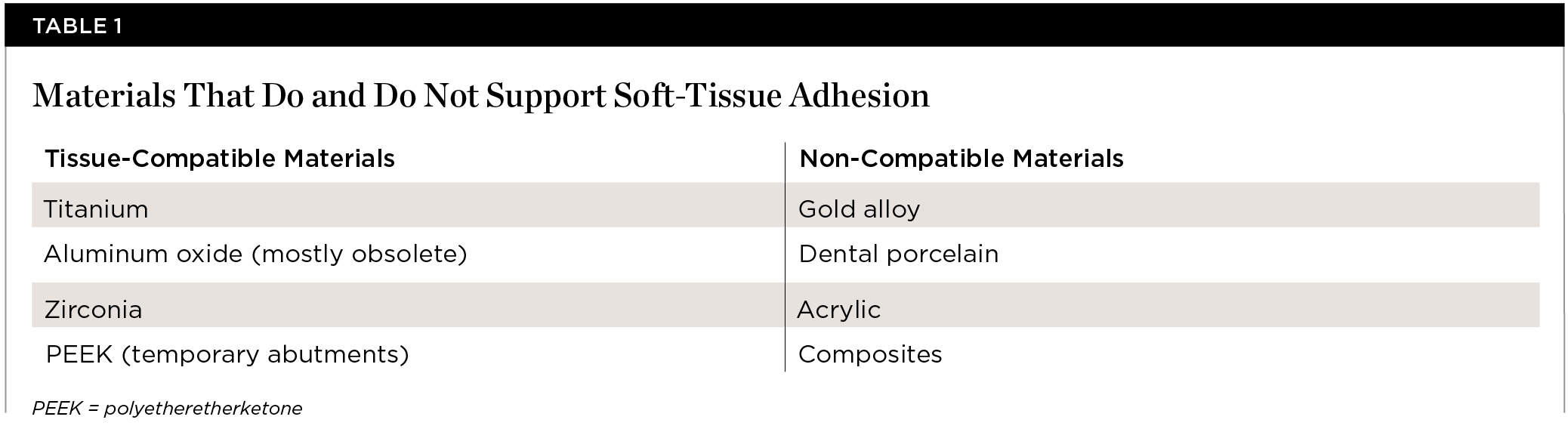 Materials that do and do not support soft-tissue adhesion are listed in Table 1. Only the tissue-compatible materials shown should be used as an abutment material for locking-taper conical connection implants. Use of non-compatible materials will result in the formation of a pocket around the abutment. Apical bone migration is likely to occur as the body strives to form the soft-tissue seal on the surface of the dental implant.