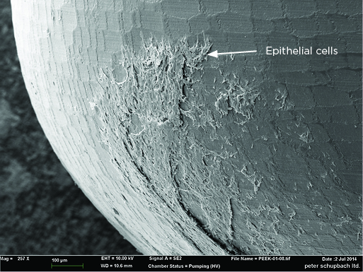 Polyetheretherketone (PEEK) polymer is widely used as a material for both temporary and healing abutments, and these are sold by many dental implant manufacturers. However, no studies demonstrate the tissue compatibility as discussed above. Schupbach and Rompen have each independently examined PEEK healing abutments removed from patients utilizing SEM, and each showed similar results. Figure 6 and Figure 7 (provided by Dr. Schupbach) show the junctional epithelium adhered to a retrieved PEEK healing abutment. These are the only two such investigations to date, and both are very small; there are no published studies to reference. However, though data is admittedly limited and more investigation of this material is needed, it appears PEEK also supports soft-tissue adhesion.
