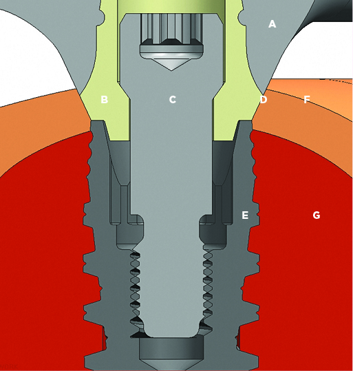 Soft-tissue seal-Similar to a natural tooth, the soft-tissue complex around a dental implant consists of sulcular and junctional epithelium and connective tissue, forming a biological width approximately 3 mm in height.5 However, unlike a natural tooth there are no connective tissue fibers imbedding into the dental implant; rather, the connective tissue forms circular bands around the implant. The epithelial cells form a very fragile hemidesmisonal seal to the tissue-compatible implant or abutment surface. Though quite fragile, this seal is critical to prevent bacterial invasion and must always be present.