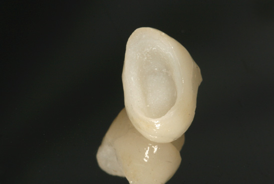 Following a try-in, any necessary adjustments can be made. Once adjusted, the crown is ready to be cleaned with standard phosphoric acid etching. After 30 seconds of cleaning, several coats of silane primer should be applied. The primer should be allowed to air-dry for 30 seconds, or a blow dryer can be used to provide clean, warm oil-free air. When the restoration is dry, the resin cement can be applied.