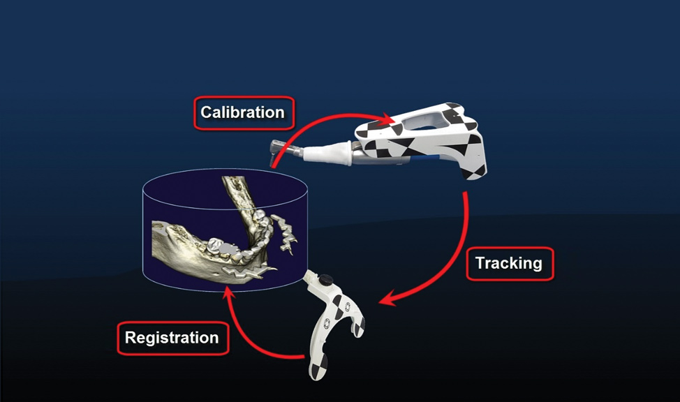 In dentistry, implant placement is possible using dynamic navigation because the micron tracker camera is able to relate the position of the patient's jaw to the position of the implant drill tip in real time. The relationship of the drill to the jaw is displayed instantaneously, allowing for continuous, immediate feedback on the mesiodistal, buccolingual, and apicocoronal positions of the implant drill (Figure 1). The three fundamental steps, which together enable the real-time mapping of the drill tip to the patient's planned CBCT image volume, are called registration, calibration, and tracking (Figure 2). The surgeon is thus able to prepare the osteotomy and place the implant based on the pre-planned, prosthetically directed implant position.