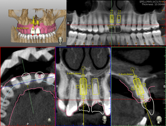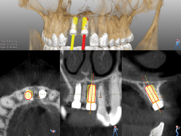 A post-placement CBCT scan was secured and compared to the preoperative CBCT plan using software inherent to the dynamic navigation system (Figure 11). Accuracy results from this case (preoperative plan compared to post-implant placement) were as follows: entry point deviation was 0.13 mm for tooth position No. 8 and 0.41 mm for No. 9; angle discrepancy was 4.3 degrees for No. 8 and 6.76 degrees for No. 9; implant apex depth deviation was 1.10 mm for No. 8 and 1.37 mm for No. 9.