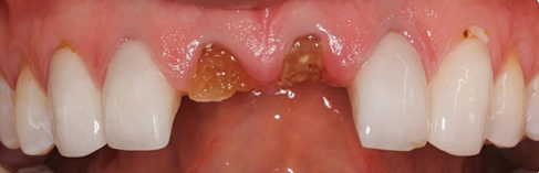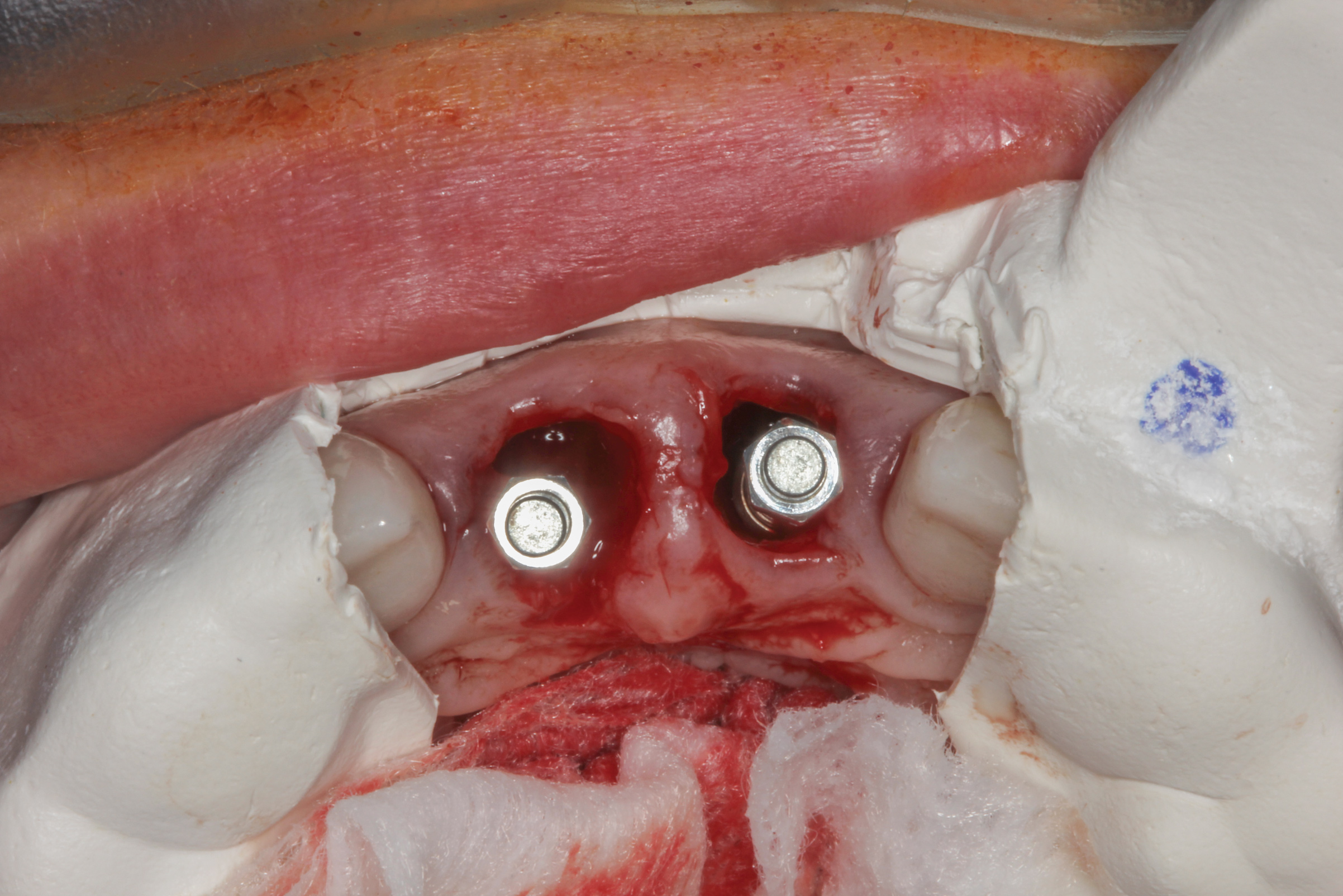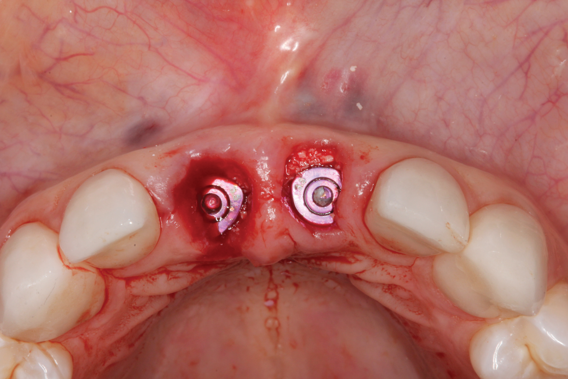 The surgery was performed under local-regional anesthesia. The thermoplastic retainer was placed over the remaining teeth and its fit/stability verified. Atraumatic extractions of teeth Nos. 8 and 9 were performed, and intact buccal bone was verified. Osteotomy site preparation and immediate implant placement were performed using the dynamic surgical navigation system. Two 3.6 mm x 9 mm implant fixtures (Astra Tech EV, Dentsply Sirona, dentsplysirona.com) were placed. SmartPegs (Osstell, osstell.com) were attached to the implants to show the trajectory of the fixture positioning. After implant placement, anorganic bovine bone matrix (Bio-Oss®, Geistlich Pharma, geistlich-na.com) was used to graft the implant alveolus "gap," and healing abutments were placed (Figure 9 and Figure 10). The patient was provided with an interim removable appliance for tooth replacement.