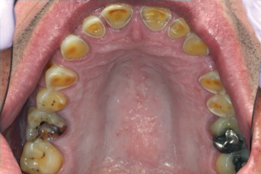 A 53-year-old man sought care at the University of Pittsburgh School of Dental Medicine for a routine oral evaluation and prophylaxis on August 12, 2016. After a full periodontal examination, the patient was reported having moderate to severe periodontitis. Probing depths ranged from 1 mm to 7 mm and several teeth had class I mobility. Severe attrition and lingual erosion were found on all maxillary teeth, except the molars (Figure 1 and Figure 2).