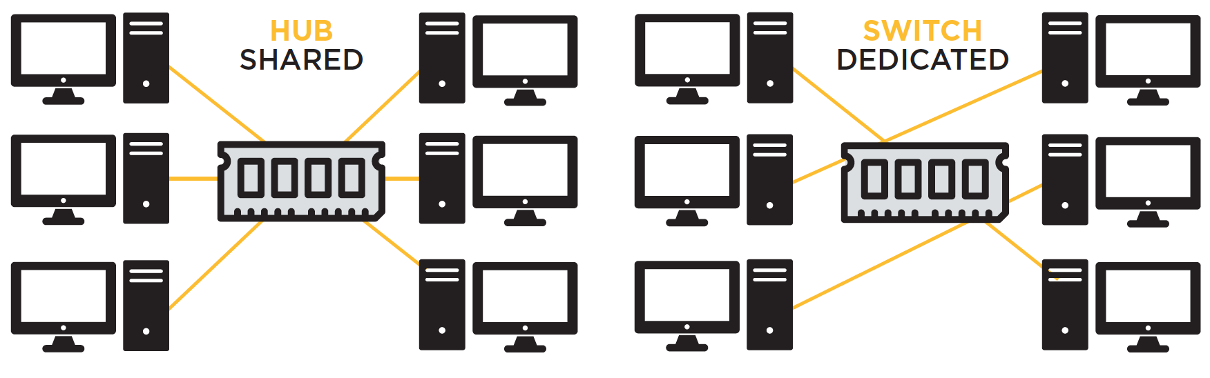 Network topology is an important factor in network transfer times. A router must be connected to the equipment provided by the ISP, or perhaps the ISP provides a router. These typically have four ports, but if more than four connections are needed, there are two options: a hub and a switch. Hubs echo all input to all connected devices (Figure 1). This tends to degrade the network's speed. In contrast, a switch will learn which device is making the network request and route the response back to that single device. The decrease in traffic increases the network's efficiency.