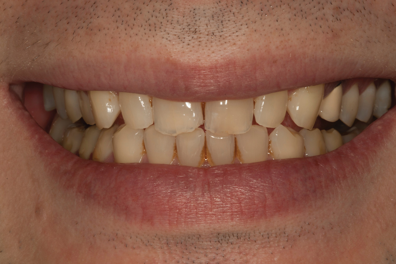 The dentofacial examination revealed a low smile line with no incisor display when the lips were in repose. The anterior teeth were chipped and worn, and their overall color was darkened. The buccal corridors were deficient, and the failing crown on tooth No. 12 was visible in a full smile.