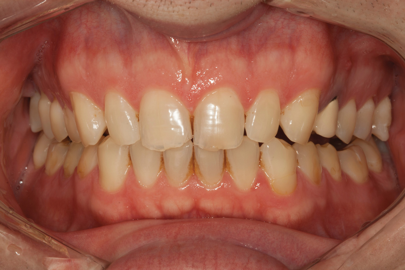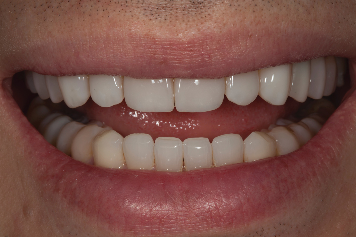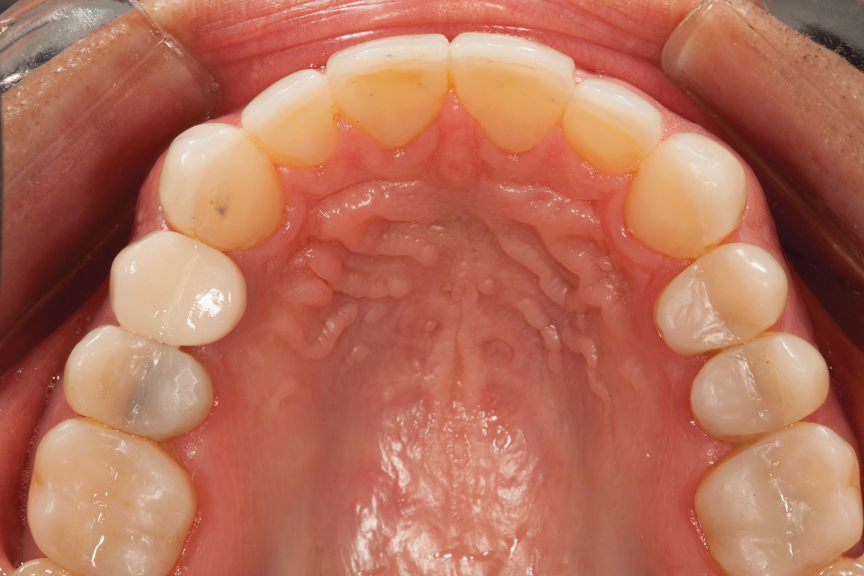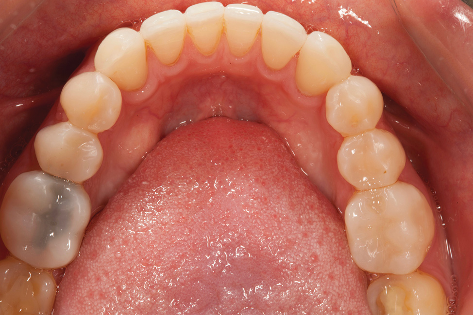 Following caries treatment and tooth preparation (Figure 6), teeth Nos. 4 through 13 were restored with direct composite veneers in stages (Figure 7 through Figure 9). Using a hybrid composite for the lingual shelf and dentin layer provides wear resistance and strength for the restoration.14,15 (The lowest wear rates for restorations and the opposing dentition occur with metal alloys, machined ceramics, and microfilled hybrid resin composites. Any adjusted and unpolished porcelain surface would elicit the most wear on the opposing teeth.11)After the composite veneers were finalized, a monolithic lithium disilicate crown was placed on tooth No. 12 during a subsequent appointment, and occlusal equilibration was carried out. Final photographs were taken a couple of weeks later (Figure 10 through Figure 14).