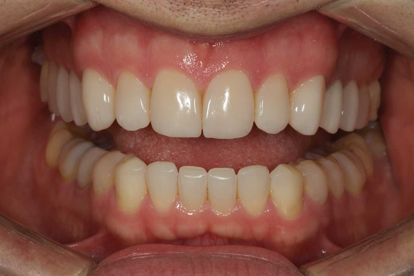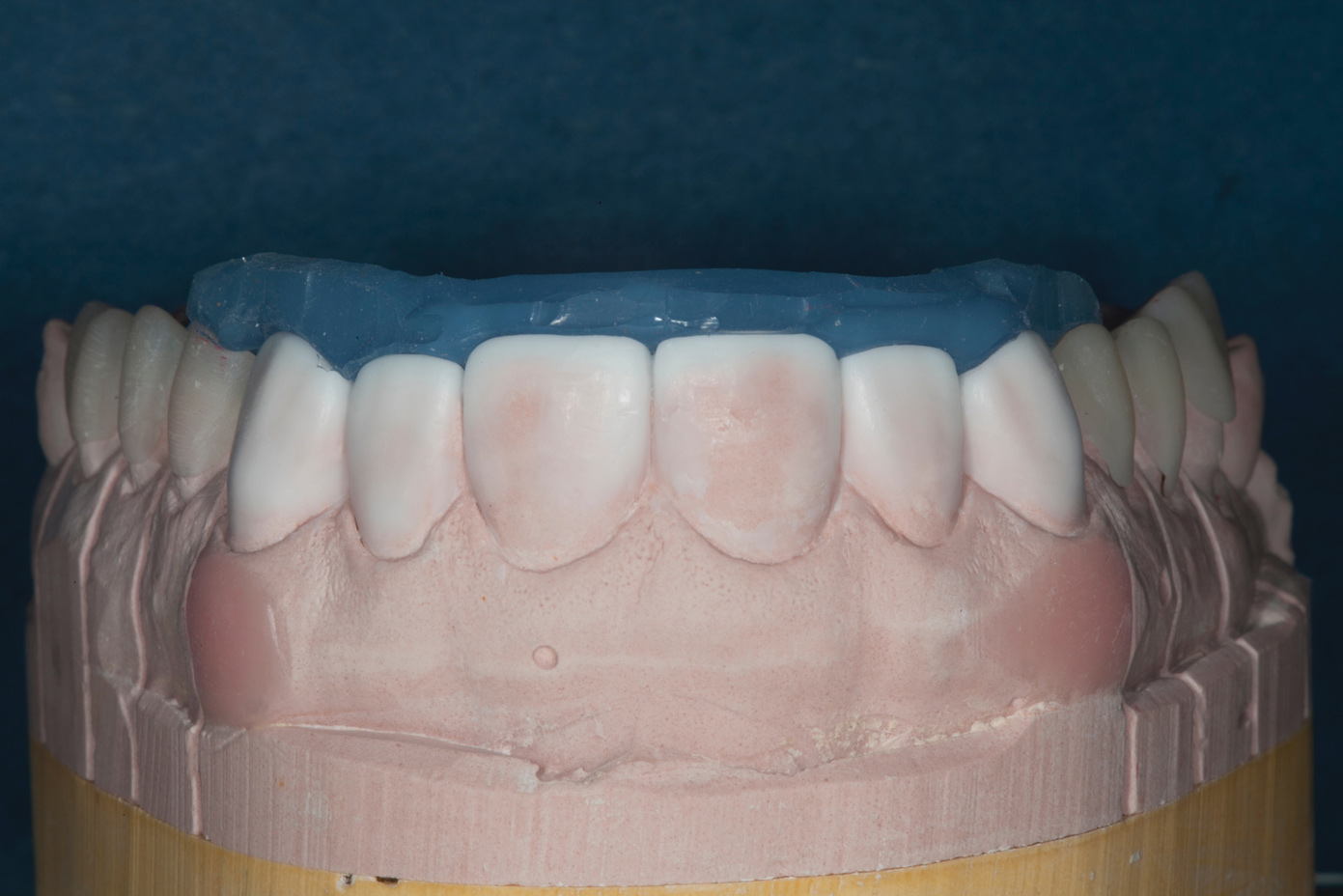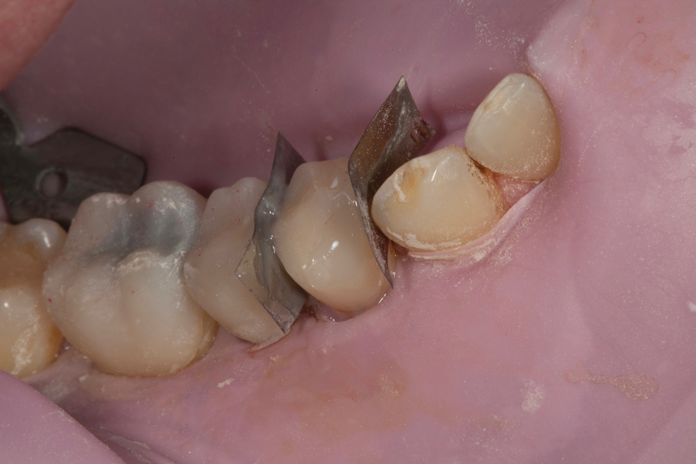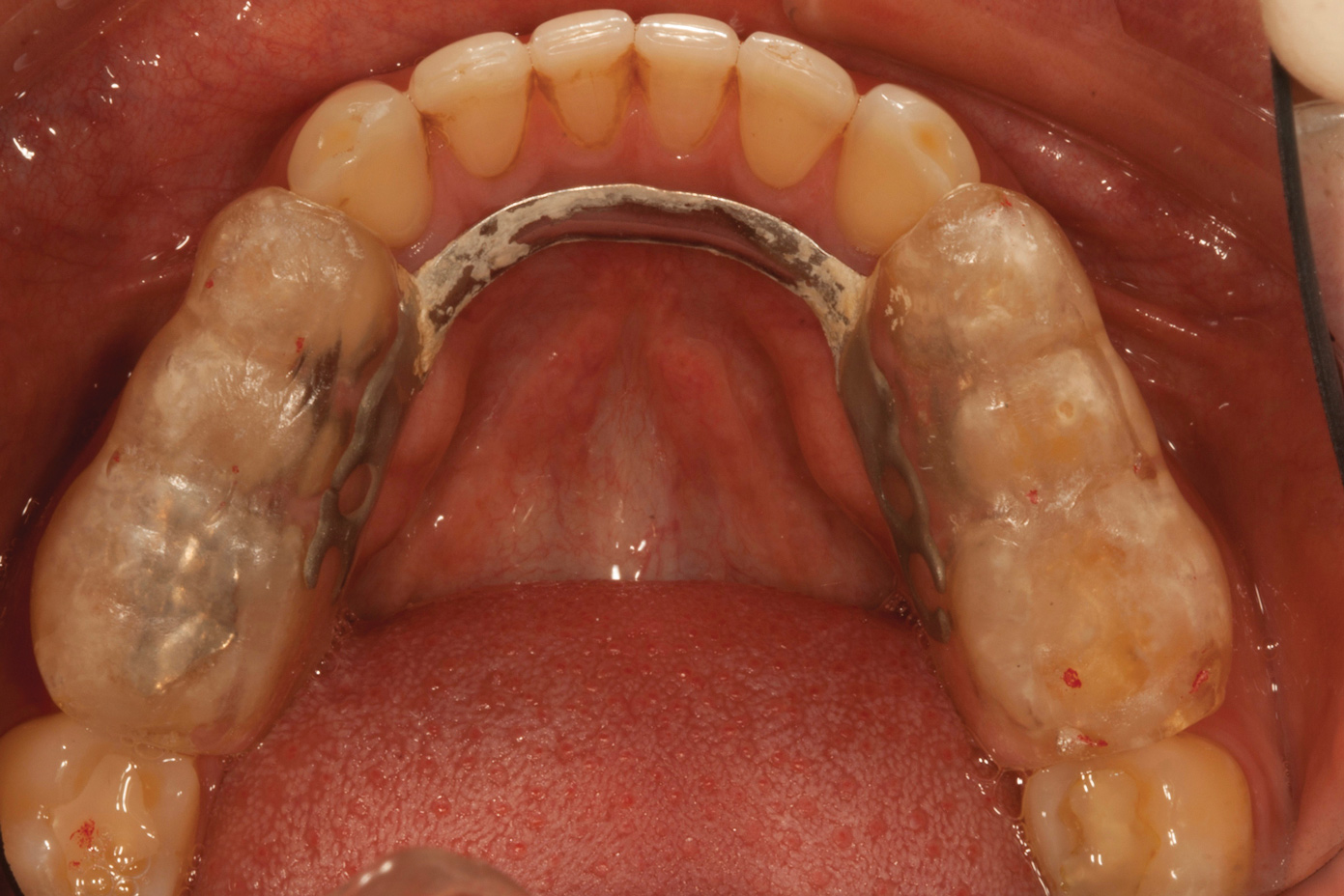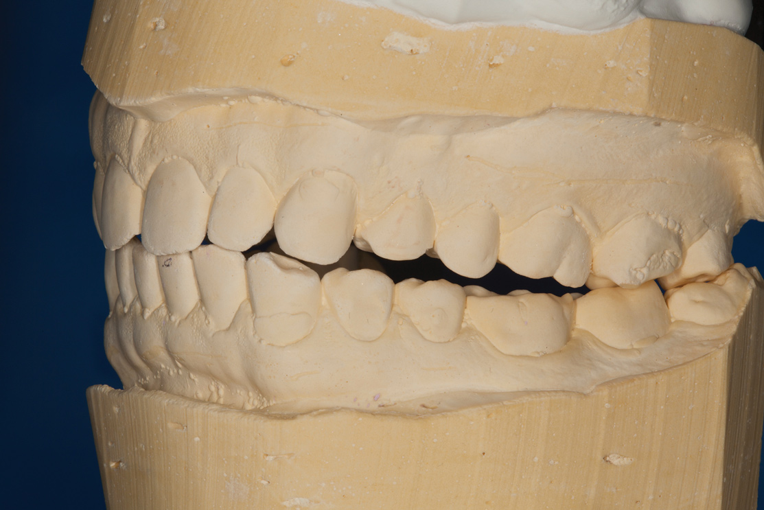 The reduced cost of these material choices was an important factor in the patient's decision-making process. To further minimize cost, the posterior units would be produced using a time-saving wax-up duplication technique by a dental technician. It was explained to the patient that the life expectancy of the posterior composite onlays was limited, and that he would eventually have to switch to a more durable option, such as porcelain.