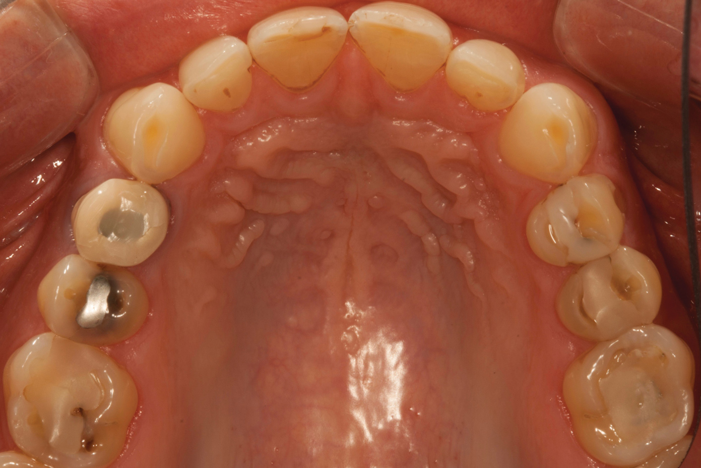 Erosion is defined as the loss of dental hard tissues from non-bacteriogenic acid, which can be either dietary or gastric. Evidence suggests that erosion may be becoming more prevalent due to the increased popularity of carbonated beverages, particularly among the younger generation, and gastric acid-related issues, namely gastroesophageal reflux disease (GERD) and bulimia. These conditions cause more severe expressions of tissue loss due the much lower pH of gastric acid when compared with dietary acids. Depending on the etiology, the hard tissue loss from erosion presents at different sites. Dietary acid-related erosion will mostly affect the buccal and occlusal tooth surfaces, particularly when combined with a swishing habit or overzealous brushing. Gastric acid erosion tends to present more on the palatal surfaces of the upper anterior segment, particularly in cases involving bulimia, in which the tongue will rub against the upper front teeth during vomiting (ie, perimylolysis).7Erosion from GERD will often present more severely on one side of the mouth, correlating with the patient's sleeping posture. All gastric acid-related issues can also affect the occlusal surfaces of the posterior teeth. Erosion and attrition often occur concomitantly, and a clinical presentation of dentinal cupping will typically exist when erosion is outpacing attrition. In addition to a medical and dental history and a clinical examination, diagnosis will include a dietary analysis. It has to be stressed that a gentle questioning approach is required in cases where bulimia is suspected.