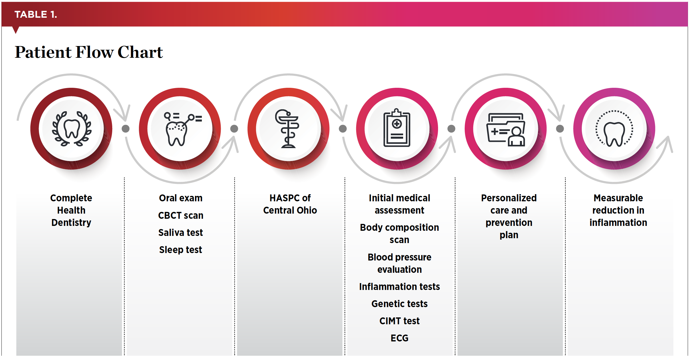 The referral flow of the patients at the HASPC of Central Ohio originates from both medical and dental practices, as indicated by the individual patient's needs and based on his or her risk for a heart attack or stroke (See Table 1. Patient Flow Chart). As part of the initial assessment, all medical patients receive a comprehensive dental exam to determine if there is any oral inflammation that could be driving systemic inflammation. The cardiologist will also refer a medical patient for a dental screening if any of the laboratory test results for inflammation are out of the optimal range. Dental patients are referred to the medical practice when they present with risk factors for heart attack, stroke, or diabetes. These risk factors may include a family history of cardiovascular disease or root causes revealed by the oral exam, the CBCT scan, salivary diagnostics, or the sleep test.