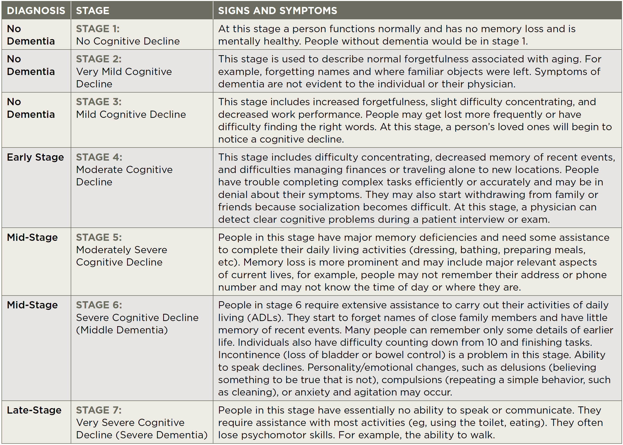 Dementia symptoms generally vary in severity and progress over time from no impairment to very severe dementia. Both the Global Deterioration Scale/Reisberg Scale and the Functional Assessment Staging Test assign seven stages to the progression of dementia (Table 1).38