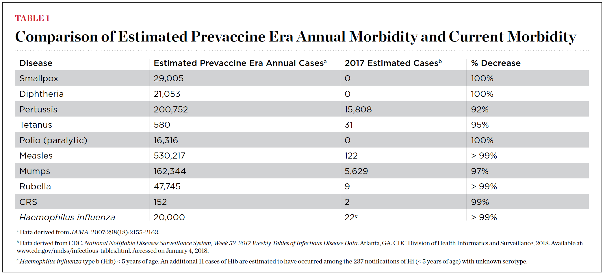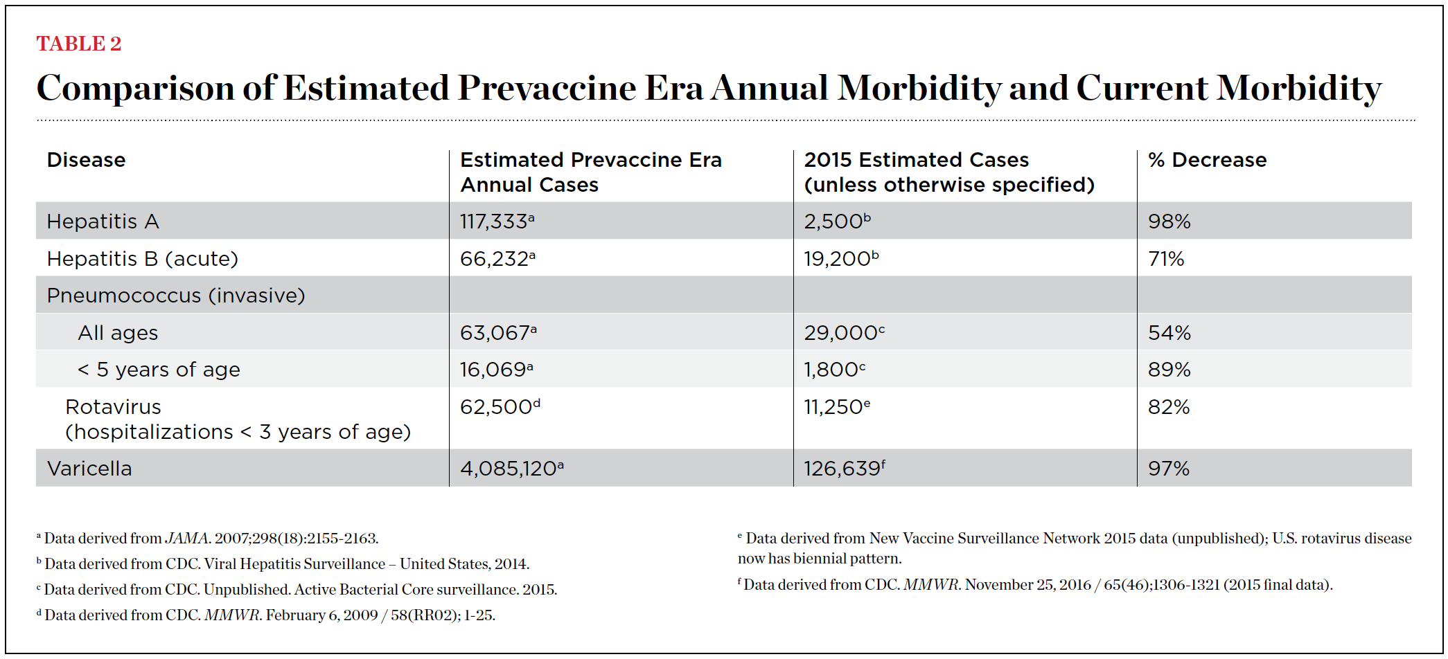 2. Roush SW, Murphy TV; Vaccine-Preventable Disease Table Working Group. Historical comparisons of morbidity and mortality for vaccine-preventable diseases in the United States. JAMA. 2007;298(18):2155-2163.