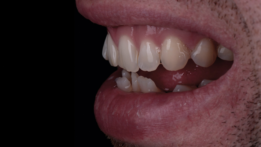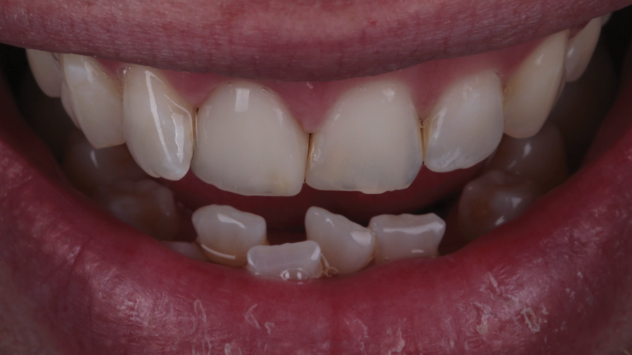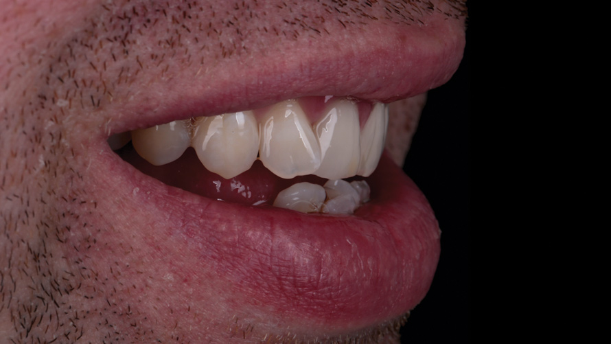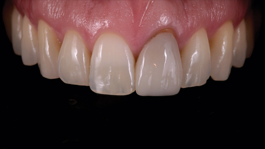 Eight weeks after the initial start of the walking bleach procedure, the final layered lithium disilicate crown was tried-in and evaluated for function and esthetics. Upon patient approval, the intaglio surface of the crown was etched for 20 seconds with a 9.6% hydrofluoric acid etchant, rinsed, and then scrubbed with a 37.5% orthophosphoric acid solution to clean out any ceramic debris. The crown was then placed into an ultrasonic bath of 91% isopropyl alcohol for 5 minutes, after which the intaglio surface was coated with silane and placed under a warm air dryer for 1 minute. A translucent self-adhesive resin cement was used to bond the final restoration to the preparation. The patients both stated that they approved of the form, function, and esthetics of the definitive restoration and that they were very pleased with the final results (Figure 13 through Figure 18). Routine periodic evaluations and radiographs were scheduled to monitor their oral health and esthetics.